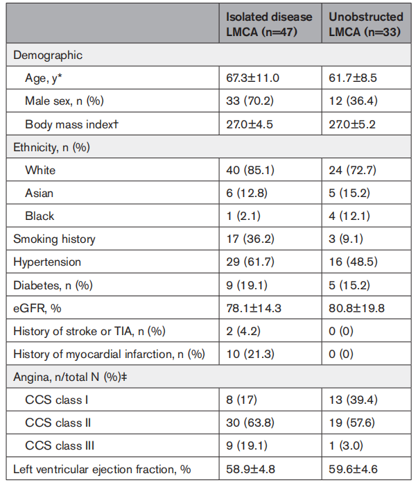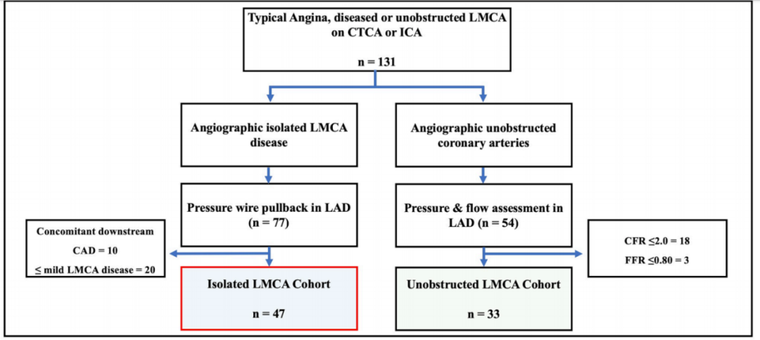 同时,共有54名患者入选无梗阻性LMCA队列,但其中21名因CFR≤2.0或FFR≤0.80被排除。最终共有33名患者被纳入无梗阻性LMCA队列,该队列所有患者均接受了双压力与多普勒评估。