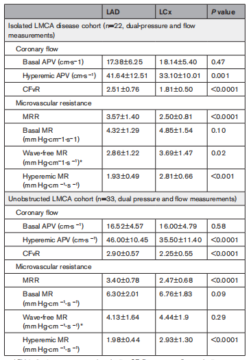 在孤立性LMCA病变患者中,压力导丝测得的血流动力学指数在LAD低于LCx,这源于LAD更高的血流速率和更低的微血管最小阻力。