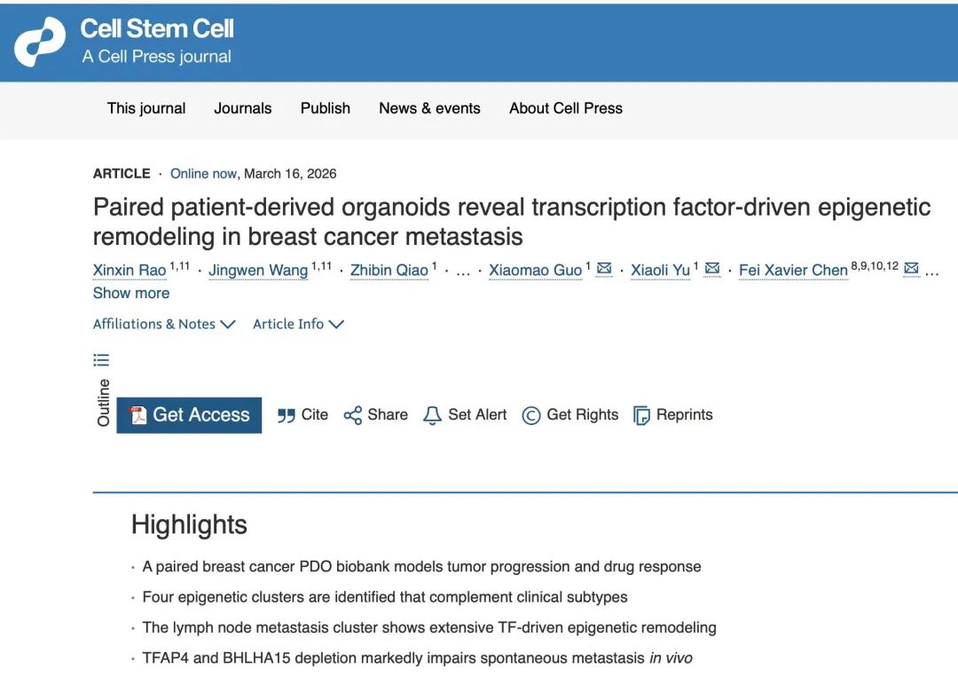 2026年3月16日,复旦大学附属肿瘤医院郭小毛、俞晓立、陈飞、沈敏洪团队合作在《Cell Stem Cell》发表研究论文Paired patient-derived organoids reveal transcription factor-driven epigenetic remodeling in breast cancer metastasis。研究团队通过建立乳腺癌患者来源类器官(PDOs)生物库,并结合多组学分析,系统描绘了乳腺癌进展过程中的表观遗传变化图谱,识别出四种不同的乳腺癌表观遗传状态,并进一步发现驱动淋巴结转移的关键转录因子网络。