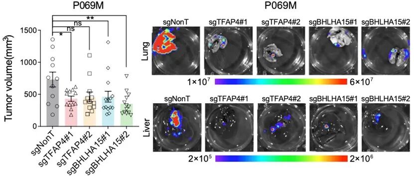 在四种状态中,研究团队重点关注Cluster 4(淋巴结转移相关状态)。通过整合ATAC-seq和RNA-seq数据,研究人员构建了转录因子调控网络,并筛选出一组关键转录因子,包括:MEF2A、NR2F1、NR2F2、NFATC4、ZNF148、TFAP4 和 BHLHA15。其中TFAP4与BHLHA15表现出最强的协同调控特征。进一步的CUT&Tag、CRISPR敲除及动物实验表明:当TFAP4或BHLHA15被敲除后,EMT和细胞外基质重塑等转移相关程序明显下降,肺和肝转移负担显著降低。这表明,这些转录因子在乳腺癌淋巴结转移过程中发挥关键驱动作用,并有望成为未来抗转移治疗的重要靶点。