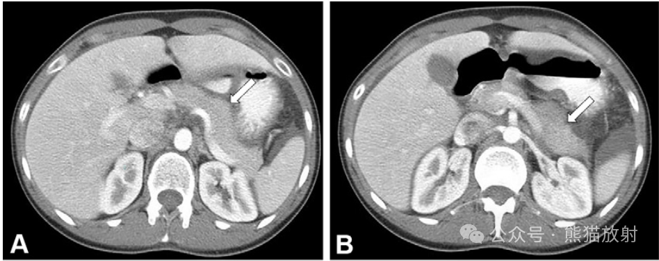 异位胰腺最常见的CT表现:壁内肿块,边缘轻度分叶、边界欠清;其密度和增强特征与组织学成分相关:腺泡占主导地位的病变表现出明显均匀强化,而导管占主导地位的表现为乏血供和不均质性。