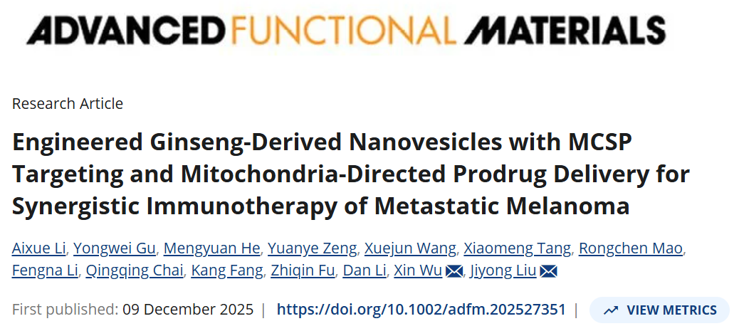 近日,复旦大学附属肿瘤医院药剂科主任刘继勇教授领衔团队发表最新研究成果,报道了一种基于人参来源纳米囊泡的工程化仿生递药系统G-NVs-MCSP/pTP。该系统通过靶向递送线粒体定向雷公藤甲素前药,并协同调控肿瘤免疫微环境,在多种黑色素瘤模型中展现出显著的抗肿瘤效果与良好的生物安全性,为转移性黑色素瘤的精准免疫治疗提供了新的研究思路。该项成果在国际权威期刊Advanced Functional Materials(中国科学院一区TOP)上发表,影响因子19分。