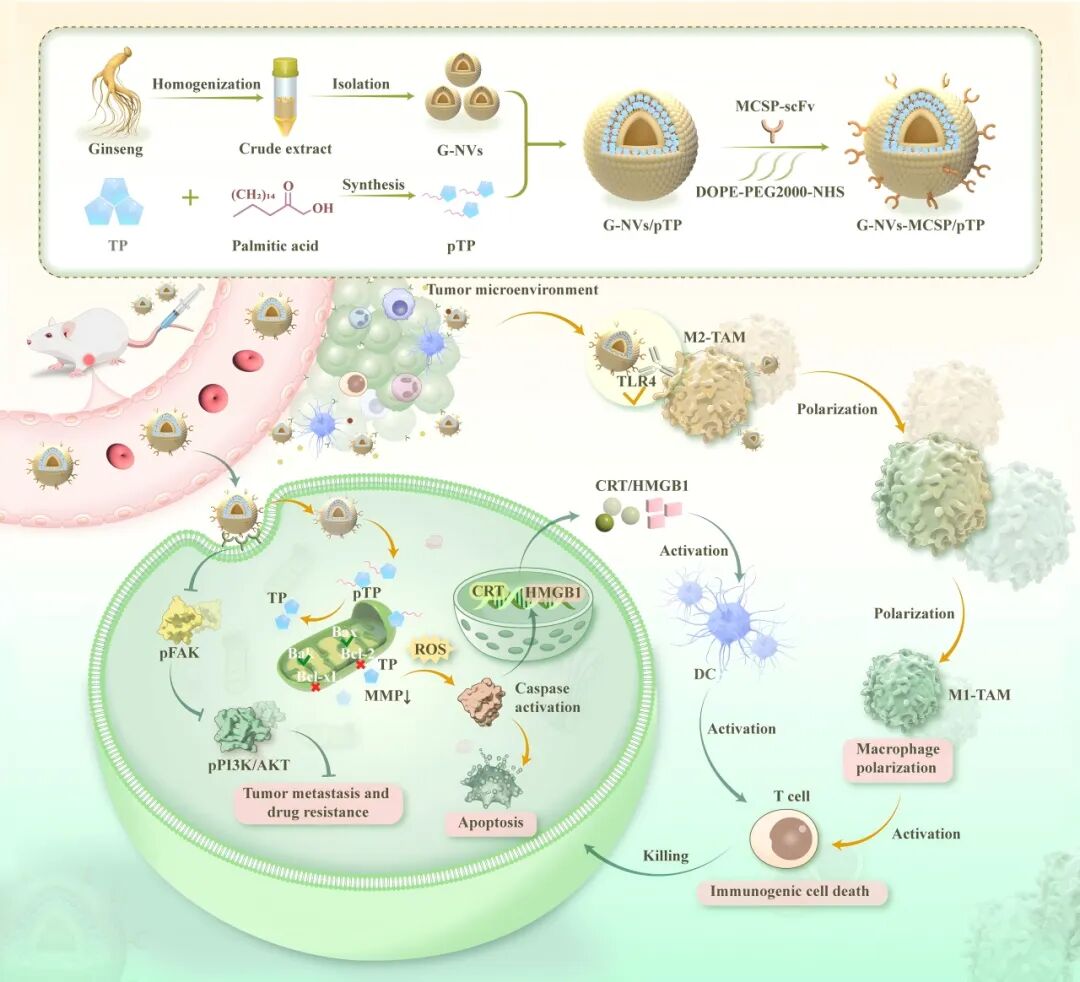 针对上述瓶颈,研究团队设计并构建了一种融合人参来源纳米囊泡(G-NVs)、线粒体靶向雷公藤甲素前药(pTP)以及黑色素瘤特异性单链抗体 MCSP-scFv 的多功能递药系统 G-NVs-MCSP/pTP,刘继勇教授指出,此项研究成果的技术优势主要体现在三个方面。“第一是实现线粒体定向递药与“增效减毒”。研究团队利用黑色素瘤细胞脂肪酸代谢活跃的特征,将雷公藤甲素与棕榈酸偶联形成前药 pTP,使其更易被肿瘤细胞摄取并在线粒体内释放活性药物,从而显著延长体内半衰期,降低心、肝、肾等器官毒性。”刘继勇教授介绍,“第二是赋予囊泡主动靶向与抗转移能力。通过在囊泡表面功能化修饰识别黑色素瘤高表达分子MCSP的单链抗体,递药系统可选择性富集于肿瘤及转移灶,并通过干预FAK/MAPK等信号通路抑制肿瘤侵袭与转移。第三是协同重塑肿瘤免疫微环境。”团队研究后发现,人参来源囊泡本身具有免疫调节活性,可诱导肿瘤相关巨噬细胞向促炎性M1表型极化;与此同时,pTP在肿瘤细胞中诱导免疫原性细胞死亡,促进树突状细胞成熟及T细胞浸润,从而形成多通路协同的抗肿瘤免疫应答。