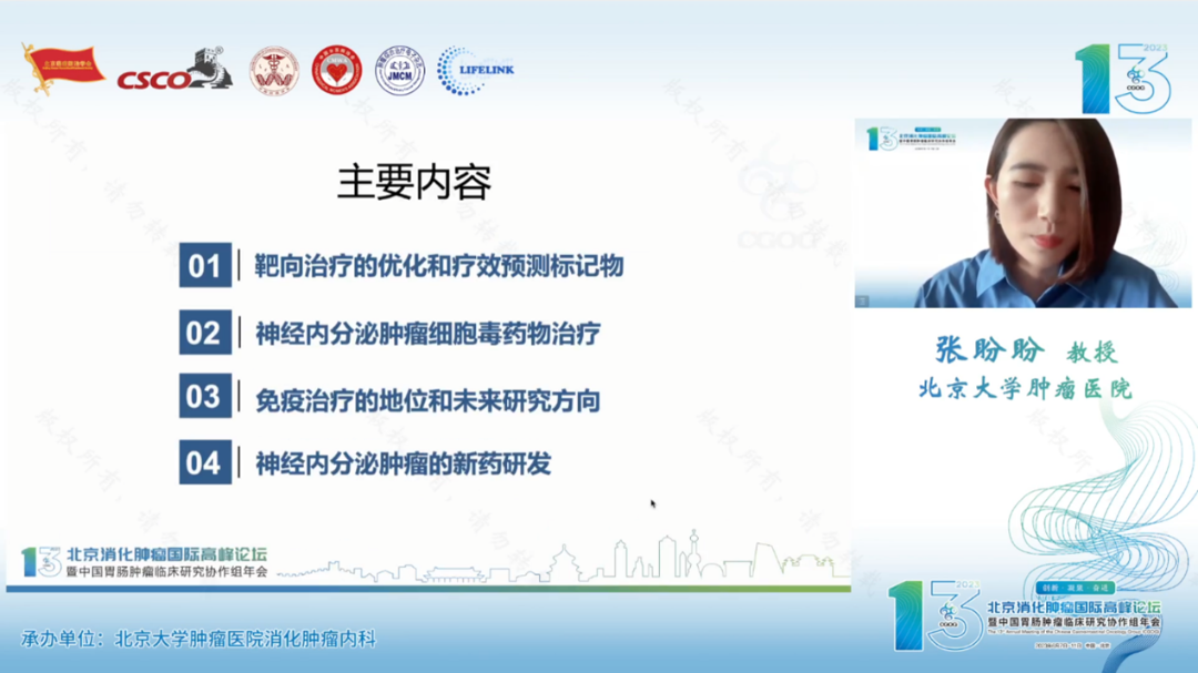 最后,北京大学肿瘤医院张盼盼教授分享了ASCO会议报道的神经内分泌肿瘤领域最新进展。张盼盼教授从靶向治疗的优化及疗效预测标记物入手,分析了卡博替尼、依维莫司等靶向药物治疗晚期神经内分泌肿瘤临床研究的最新结果,此外有研究显示TSC1/TSC2致病突变或PAK4/NAMPT高表达可能与依维莫司疗效相关,可用于筛选潜在获益人群。此外,张盼盼教授梳理了目前神经内分泌肿瘤后线治疗中化疗药物的布局,以及正在开展的白蛋白紫杉醇联合贝伐珠单抗二线治疗转移性肺外神经内分泌癌的中期研究结果。随后,张盼盼教授介绍了目前免疫检查点抑制剂治疗神经内分泌肿瘤的研究进展,并对PARP/ATR/WEE1/DLL3抑制剂等新药研发方向进行了展望。
