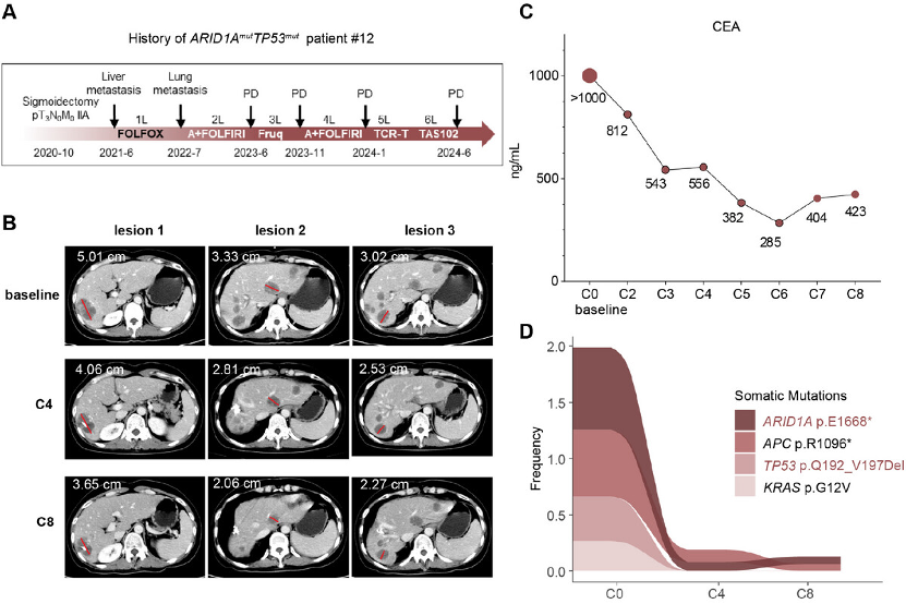 在机制研究之外,WEE1抑制剂的潜在临床价值也开始显现。在一项Ⅱ期临床研究中,一名多线治疗失败、携带ARID1A/TP53双突变的晚期结直肠癌患者接受了新型WEE1抑制剂SC0191联合贝伐珠单抗治疗。治疗后,该患者肿瘤标志物CEA由超过1000 ng/mL下降至285 ng/mL,CT评估显示多发肝转移灶持续缩小,最大病灶退缩27.1%。不过需要强调的是,目前观察到的疗效主要来自个案层面的初步信号,整体患者数量仍然有限。这些结果更多提示该治疗策略在双突变亚型中具有潜在活性,其真实临床获益仍有待后续更大规模、前瞻性研究进一步确认。