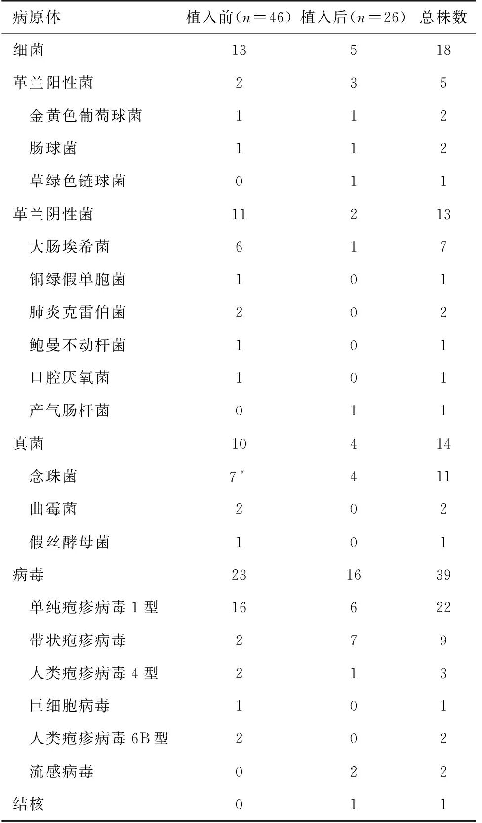 病原体 表2总结了ASCT后90 d内感染的病原体。共检出18株细菌,革兰阴性菌较革兰阳性菌多见,大肠埃希菌(7例)是最常见细菌,其次为金葡菌、肠球菌和肺炎克雷伯杆菌(各2例)。真菌感染以念珠菌为主(11例),其中仅1例白色念珠菌血症确诊为侵袭性真菌病。病毒感染最常见的是HSV-1(22例),其次为VZV(9例)。植入前细菌、真菌和HSV-1感染的数量较植入后多,而VZV感染在植入后多见。