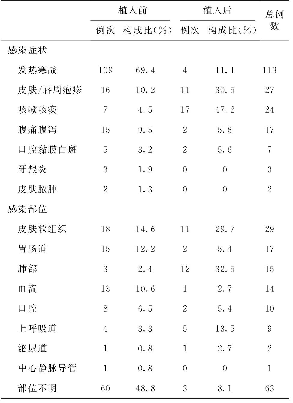 感染症状和部位 植入前后的感染症状和部位见表1。385例患者中,113例(29.4%)至少出现过一次感染性发热,大部分(96.5%)感染性发热发生于植入前。发热持续中位时间为2(1~7)d。除发热外,常见起病症状包括皮肤或唇周疱疹、咳嗽咳痰以及腹痛腹泻。