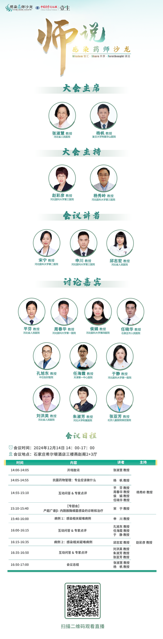 前言:2024年12月14日,2024师说·感染药师沙龙河北站即将在河北省石家庄市召开。大会旨在凝聚智慧、整合资源,将感染科、药剂科、呼吸科等多个学科紧密团结起来,共同推动中国临床抗感染药物的规范化应用。