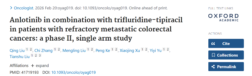 安罗替尼作为一种多靶点酪氨酸激酶抑制剂,能够同时抑制多条与肿瘤血管生成和肿瘤生长相关的信号通路,已在多种肿瘤中展现出良好的抗肿瘤活性和安全性。近日,复旦大学附属中山医院肿瘤内科刘天舒教授团队在国际知名期刊《The Oncologist》上发表了题为"Anlotinib in combination with trifluridine-tipiracil in patients with refractory metastatic colorectal cancers: a phase II ,single arm study"的前瞻性 Ⅱ期临床研究,系统评估了安罗替尼联合 TAS-102 作为三线治疗方案在难治性转移性结直肠癌患者中的疗效与安全性,为肠癌后线治疗患者的临床管理提供了新策略。该研究结果曾于2025年 AACR 国际会议上进行摘要报告。