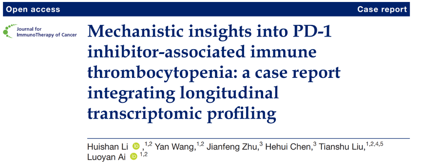 近期,复旦大学附属中山医院刘天舒团队在国际知名肿瘤免疫治疗期刊The Journal for ImmunoTherapy of Cancer (影响因子10.3,肿瘤免疫治疗学会(SITC)官方期刊)上发表了一项创新性病例研究,通过对病例的动态追踪和专业检测分析,首次清晰描绘出PD-1抑制剂相关血小板减少症的发病分子特征,提出了“外周血小板破坏加速”与“骨髓血小板生成受抑”并存的双重致病原因,为解开这一医学难题提供了新方向。