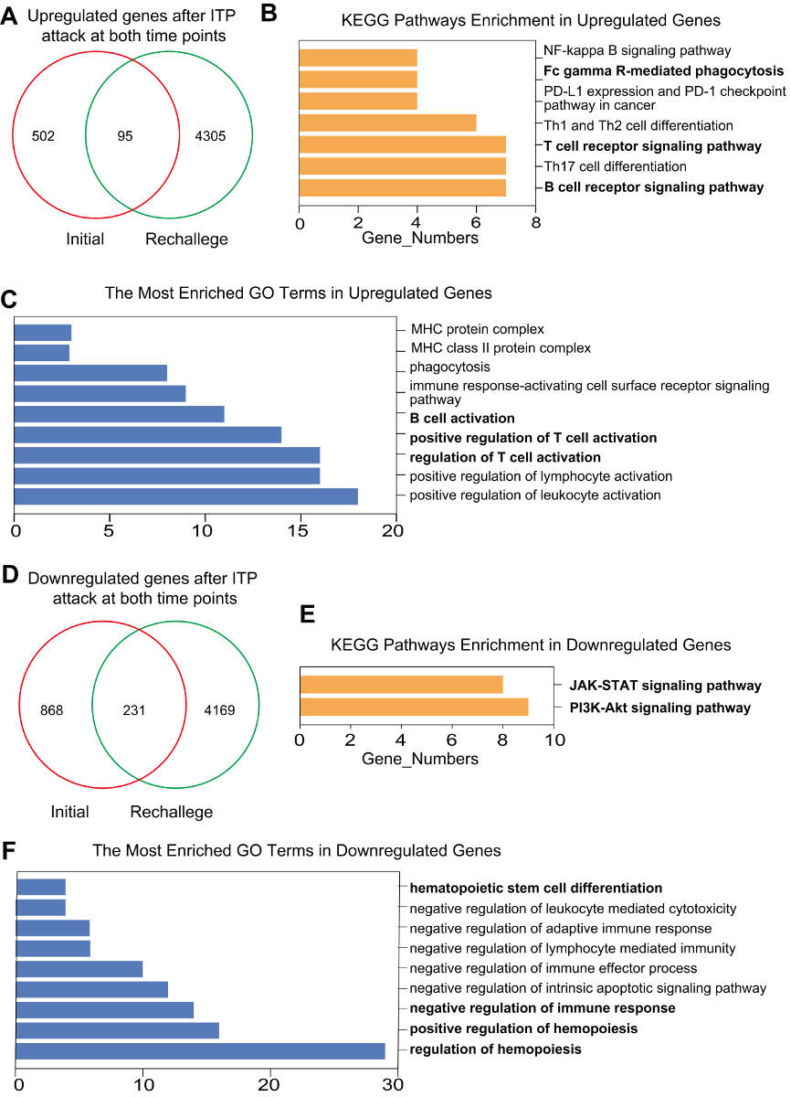 另一方面,有231个基因的表达明显降低,这些基因集中在造血调控、干细胞分化等关键通路,说明在血小板被加速清除的同时,骨髓中负责生成血小板的巨核细胞,其分化和生成血小板的功能也受到了抑制。
