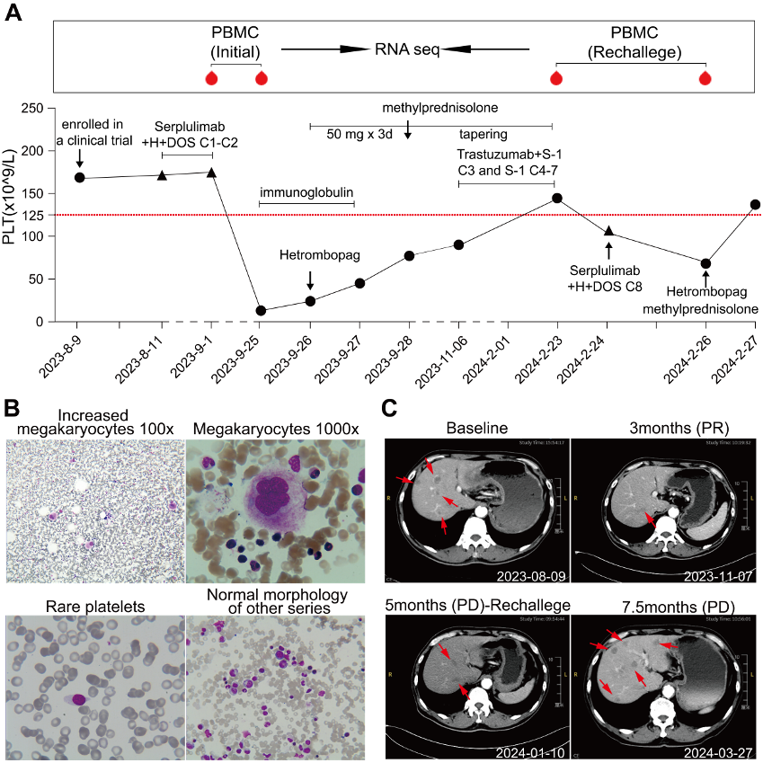 2023年,一例晚期胃腺癌(HER2阳性,PD-L1 CPS=10)患者加入一项临床研究,开始接受PD-1抑制剂斯鲁利单抗联合曲妥珠单抗及化疗(DOS方案)的一线治疗。然而在第二周期治疗后,患者出现了4级血小板减少(13×109/L)。经系统检查,确诊为免疫治疗相关的ITP。通过联合使用糖皮质激素、静脉注射免疫球蛋白及促血小板生成药物,患者血小板计数逐步回升。