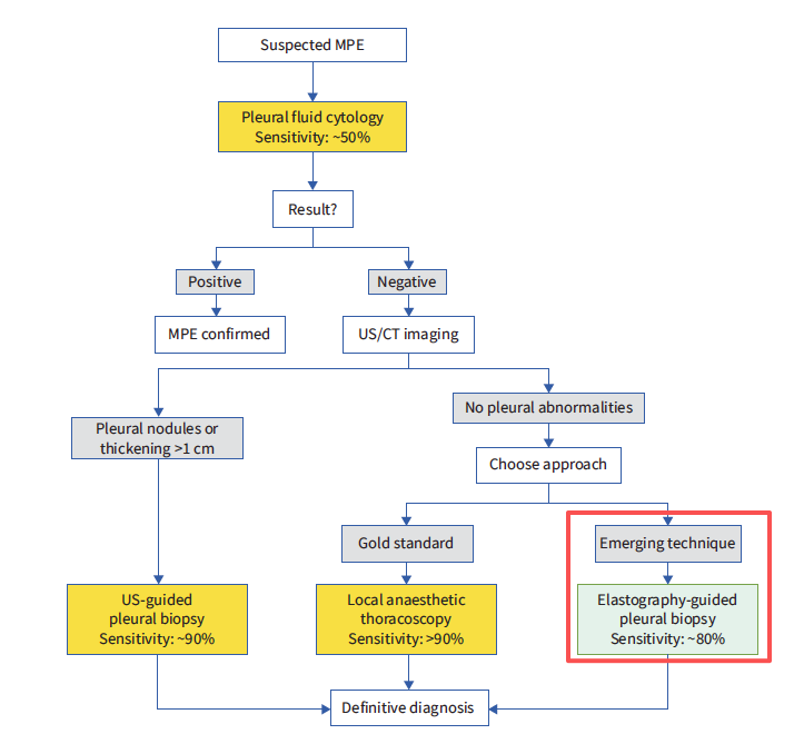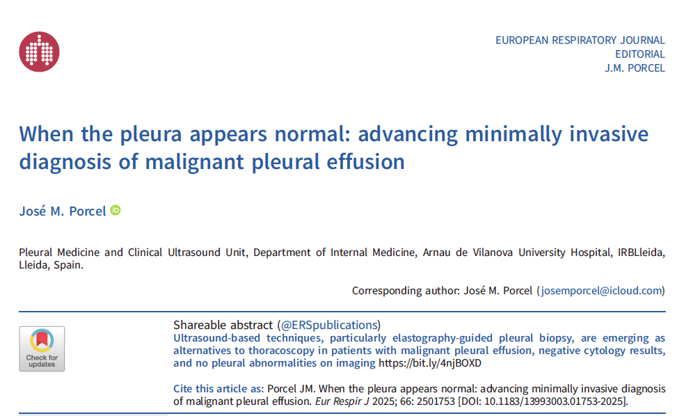 同期European Respiratory Journal配发杂志版块编辑、西班牙学者José M. Porcel教授的述评文章When the pleura appears normal: advancing minimally invasive diagnosis of malignant pleural effusion。述评指出,该研究成功证实了超声弹性成像引导胸膜活检(UEPB)在胸膜影像学表现正常的患者中具有诊断优势,其诊断敏感性显著高于传统超声引导胸膜活检。文章强调,UEPB 为那些不适合或无法接受胸腔镜检查的胸膜影像学正常的患者提供了一种安全、有效且更易实施的替代选择。同时,述评还将 UEPB 纳入其提出的疑诊恶性胸腔积液患者的诊断新流程中,体现了UEPB作为新兴微创诊断技术的应用前景。