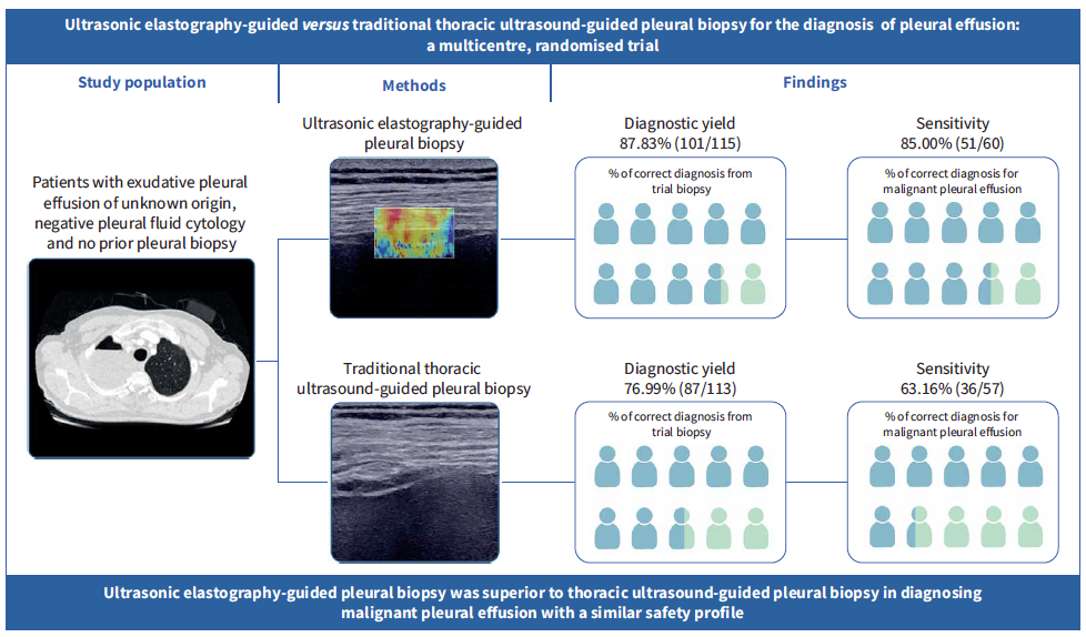 近日,国家呼吸医学中心、中日友好医院呼吸与危重症医学科侯刚教授团队联合浙江大学医学院附属第二医院、贵州省人民医院、中国医科大学附属第一医院、哈尔滨医科大学附属第二医院,在呼吸领域权威期刊European Respiratory Journal上发表了题为Ultrasonic elastography-guided pleural biopsy versus traditional thoracic ultrasound-guided pleural biopsy for the diagnosis of pleural effusion: a multicentre, randomised trial的UPDATE 2研究。该研究首次通过随机对照试验证实,超声弹性成像引导胸膜活检(Ultrasonic elastography-guided pleural biopsy, UEPB)在诊断恶性胸腔积液(Malignant pleural effusion, MPE)方面,较传统胸超声引导胸膜活检(Traditional thoracic ultrasound-guided pleural biopsy, TUSPB)具有更高的诊断灵敏度,且安全性相当。同期杂志配发专家述评,对该研究的临床价值与创新性给予肯定。