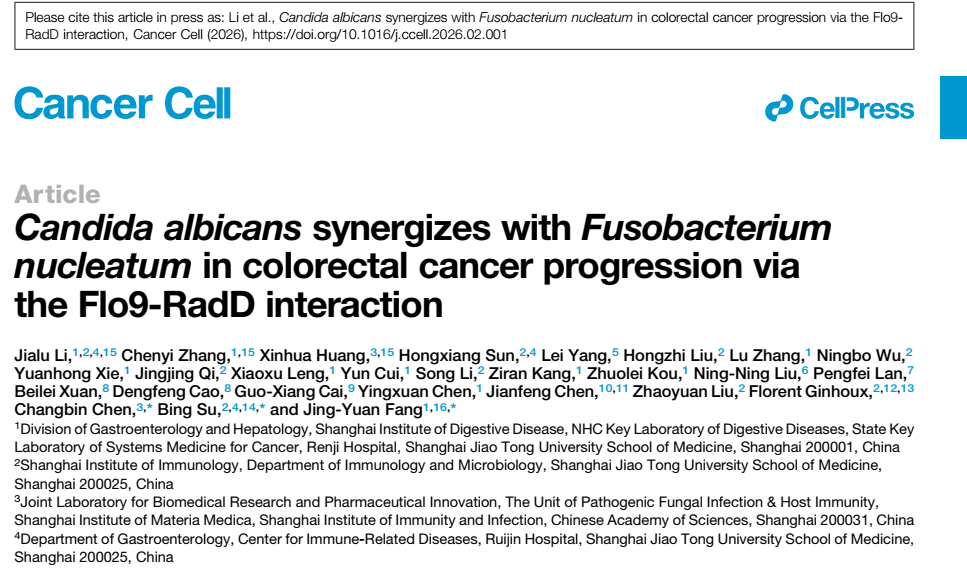 2月26日,上海交通大学医学院附属仁济医院房静远院士团队联合上海交通大学医学院上海市免疫学研究所与中国科学院上海免疫与感染研究所团队在Cancer Cell(IF:42)上在线发表了题为“Candida albicans synergizes with Fusobacterium nucleatum in colorectal cancer progression via the Flo9-RadD interaction”的研究成果,首次系统描绘肠道真菌与细菌在结直肠癌中的协同作用机制,并为靶向微生物互作的肿瘤干预策略提供全新切入点。
