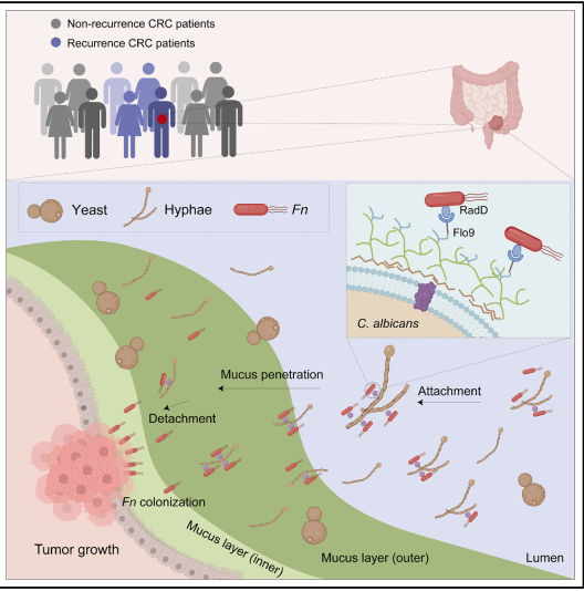 本研究首次揭示肠道共生真菌白念珠菌与致病细菌具核梭杆菌之间的直接物理相互作用,并系统阐明其分子基础与促癌效应。研究提出了一种新的肿瘤微生物学范式:肠道真菌并非被动的共生定植者,而是能够通过菌丝相介导的跨界黏附,主动协助致病细菌突破定植屏障、重塑肠道生态位。这一“真菌-细菌轴”的发现不仅拓展了对肠道微生物群与结直肠癌关系的认知边界,也为靶向微生物互作的肿瘤防治策略开辟了新的方向。