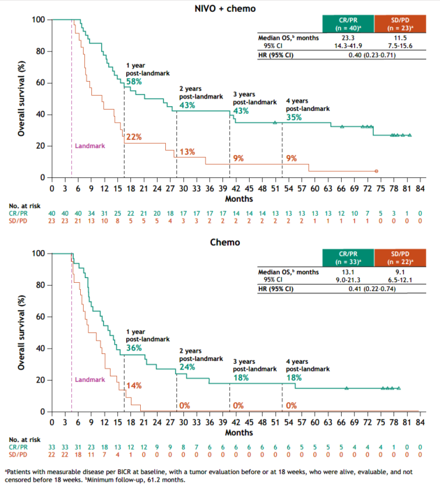 换言之,只要患者接受纳武利尤单抗+化疗、并在18周内取得应答(CPS≥5人群ORR:68%),即有超过1/3的机会实现4年以上的长期生存,这一比例是免疫治疗组的SD/PD患者的近4倍(9%,HR0.40),是化疗组CR/PR患者的近2倍(18%)。在以长生存为目标的背景下,以上数据可帮助医师根据用药后的短期反应及时调整后续治疗策略和目标,因而具有重要临床意义;从中也可看出,纳武利尤单抗+化疗不仅短期有效率高(接近70%),且能充分地将其转化为长期生存,这也是其综合疗效优异的基础。