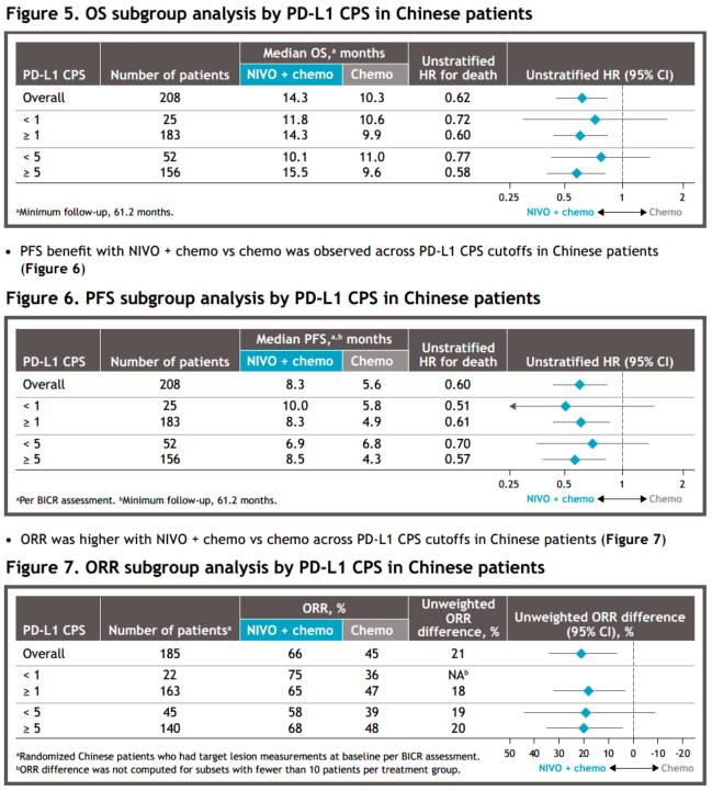本次公布的数据中,对于中国亚组CPS<1、CPS<5的患者,其OS HR分别为0.72、0.77,相比之前FDA基于3项III期研究分析得出的全球人群数据(CPS<1/5人群OS HR:0.91/0.89,图4),有所改观;其PFS、ORR也均观察到了一致的获益趋势。是否中国人群获益更高,尚未可知,由于样本量较小,其获益还需进一步验证。