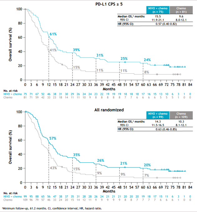 CheckMate-649是全球首个成功的探索一线免疫治疗方案(纳武利尤单抗+化疗)用于晚期胃癌治疗的III期研究。研究主要结果于2020年欧洲肿瘤内科学会(ESMO)大会首次公布;并于2021年美国癌症研究协会(AACR)大会上首次披露了研究预设的中国亚组数据,获益幅度相比全球人群更为亮眼,引发了学术界轰动,也确立了一线免疫治疗+化疗在中国晚期胃癌中的标准地位。本次ASCO GI大会公布了该研究全球人群与中国人群的5年随访结果[1],这也是目前免疫治疗在该领域唯一的五年长生存数据。