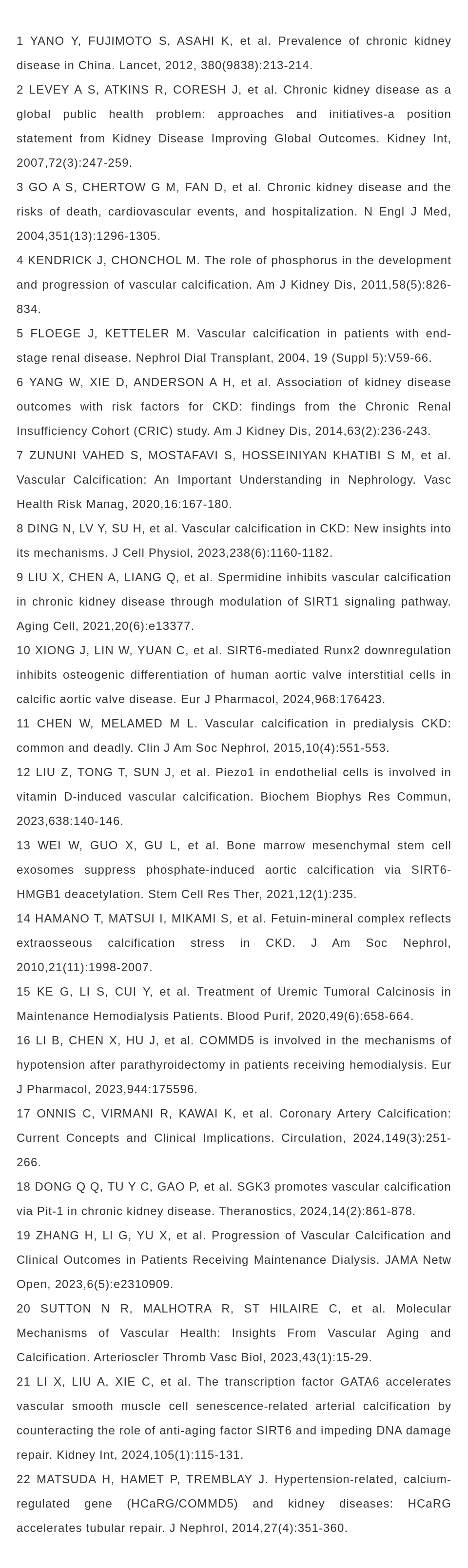 CKD是一个全球性的公共卫生问题,CKD患者的不良预后与血管钙化密切相关,血管钙化是CKD相关死亡的独立危险因素[17]。血管钙化的特征是结晶羟基磷灰石在脉管系统中异常沉积[18]。接受透析的ESKD患者的血管钙化患病率为90.7%,在4年随访中,86.5%的患者出现血管钙化的进展[19]。血管钙化与血管顺应性增加密切相关,并且是心力衰竭、高血压和心律失常等不良心血管事件的重要促进因素[20-21]。目前,透析患者血管钙化的传统疗法,如充分透析和降磷措施,疗效有限。因此,迫切需要进一步的研究来阐明血管钙化的分子机制。