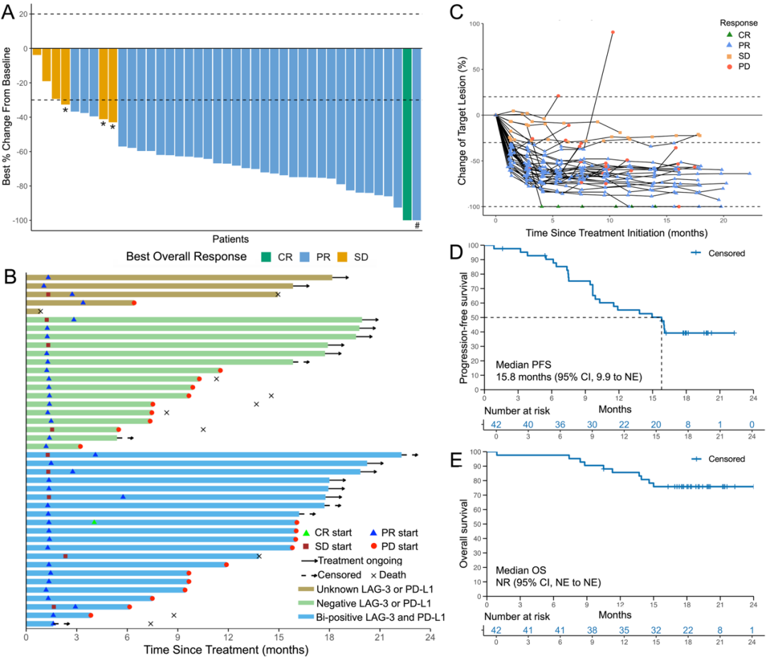本研究是一项开放标签、多中心的II期临床试验,共纳入42例未经系统治疗的复发或转移性鼻咽癌患者。所有患者接受抗LAG-3单抗(LBL-007)+抗PD-1单抗(替雷利珠)+吉西他滨-顺铂方案治疗4–6个周期,随后进入LBL-007联合替雷利珠维持治疗。研究显示,客观缓解率(ORR)达83.3%,疾病控制率(DCR)达97.6%,中位无进展生存(PFS)期达15.8个月,中位总体生存(OS)期尚未达到,12个月总体生存率为85.6%(图1)。值得关注的是,超过一半的应答患者缓解持续时间超过12个月,提示该方案具有更持久的疾病控制潜力。