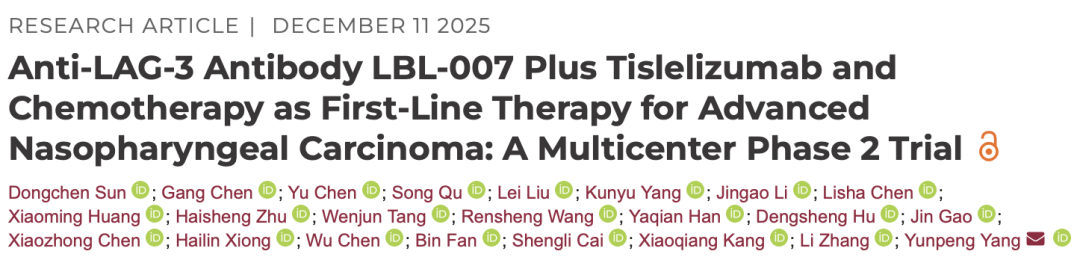 近日,中山大学肿瘤防治中心张力、杨云鹏教授团队在美国癌症研究协会官方杂志《临床癌症研究》(Clinical Cancer Research)杂志在线发表了题为“抗LAG-3单抗(LBL-007)联合抗PD-1单抗(替雷利珠单抗)及吉西他滨-顺铂化疗一线治疗复发或转移性鼻咽癌”的Ⅱ期多中心临床研究成果。研究结果显示,LAG-3/PD-1联合阻断+化疗展现出显著的抗肿瘤活性和良好的安全性,为鼻咽癌一线治疗提出了“双免疫检查点+化疗”的创新策略。