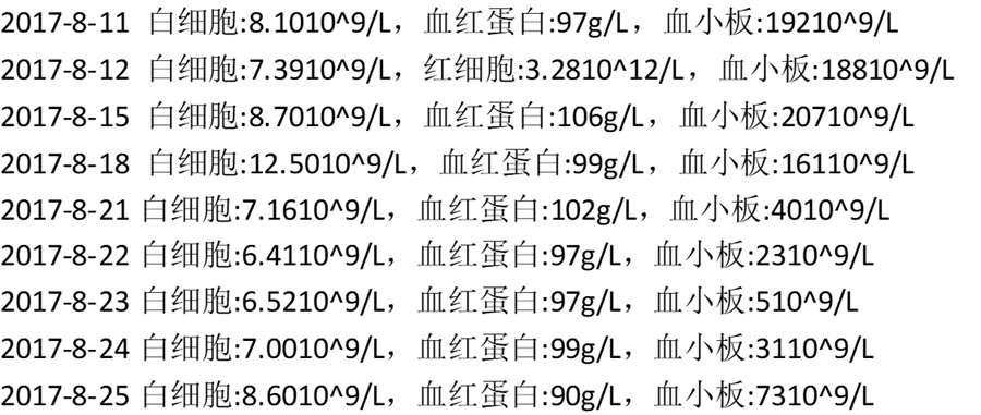 2017-8-25白细胞:8.6010^9/L,血红蛋白:90g/L,血小板:7310^9/L