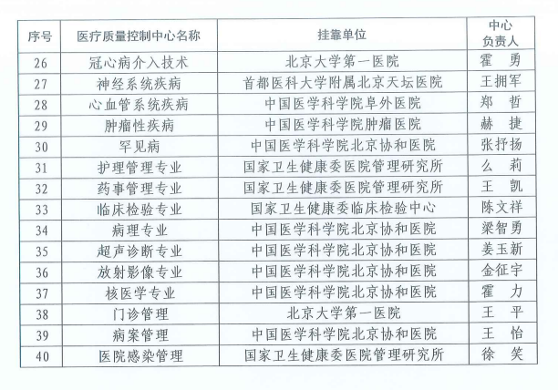 为进一步规范医疗质量控制中心(以下简称“质控中心”)的建设与管理,根据《医疗质量控制中心管理规定》(国卫办医政发﹝2023﹞1号)。结合既往工作情况和2022年度国家级质控中心考核评估情况,国家卫生健康委医政司对已成立的部分国家级质控中心的名称和质控工作范围进行了调整,并重新确定了各国家级质控中心专家委员会名单,现予以公布。本次公布的国家级质控中心及专家委员会任期自发文之日起至2025年12月31日结束。