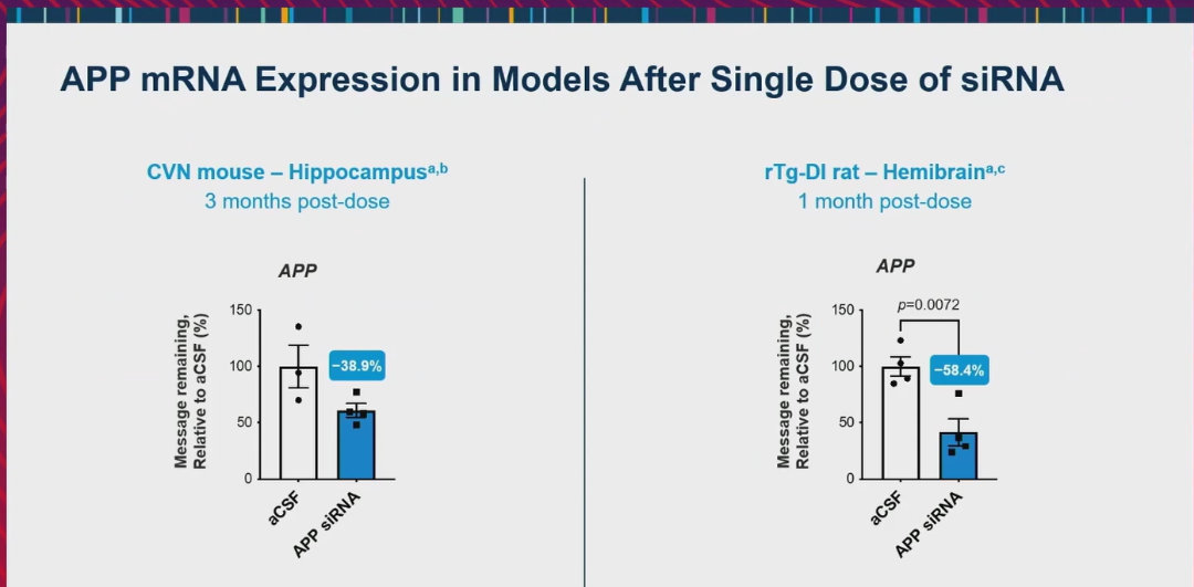 CVN小鼠实验中,研究者在6月龄小鼠脑室内单次注射120ug Mivelsiran或等量人工脑脊液,给药后3个月检测APP mRNA的表达,给药后3个月及6个月通过免疫组化检测Aβ和血管平滑肌标志物αSMA的表达。rTg-DI大鼠实验中,研究者在3月龄大鼠脑内单次注射900ug Mivelsiran或等量人工脑脊液,给药后1个月检测APP mRNA的表达,给药后6个月通过免疫组化检测Aβ沉积及脑微出血的发生。