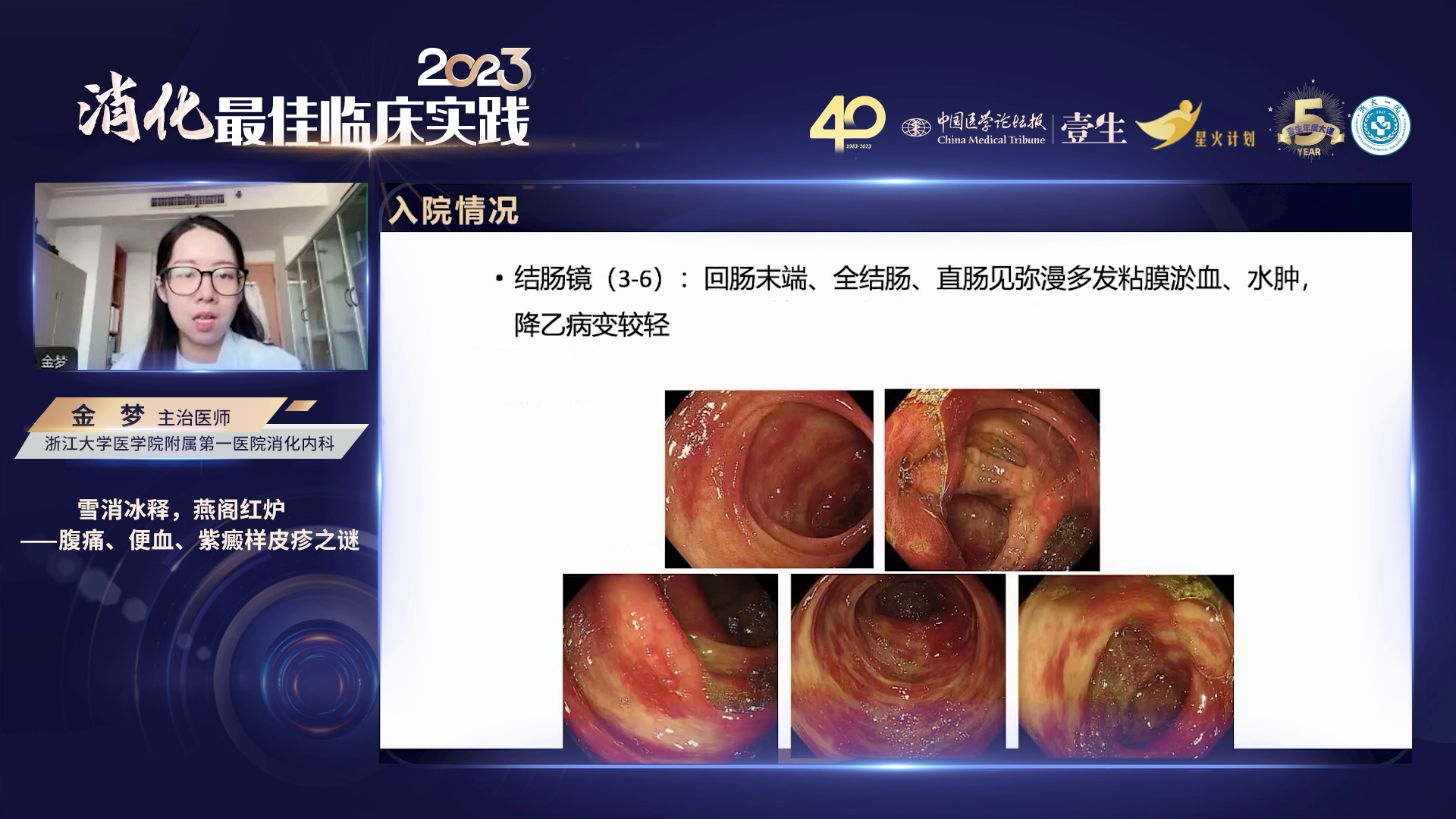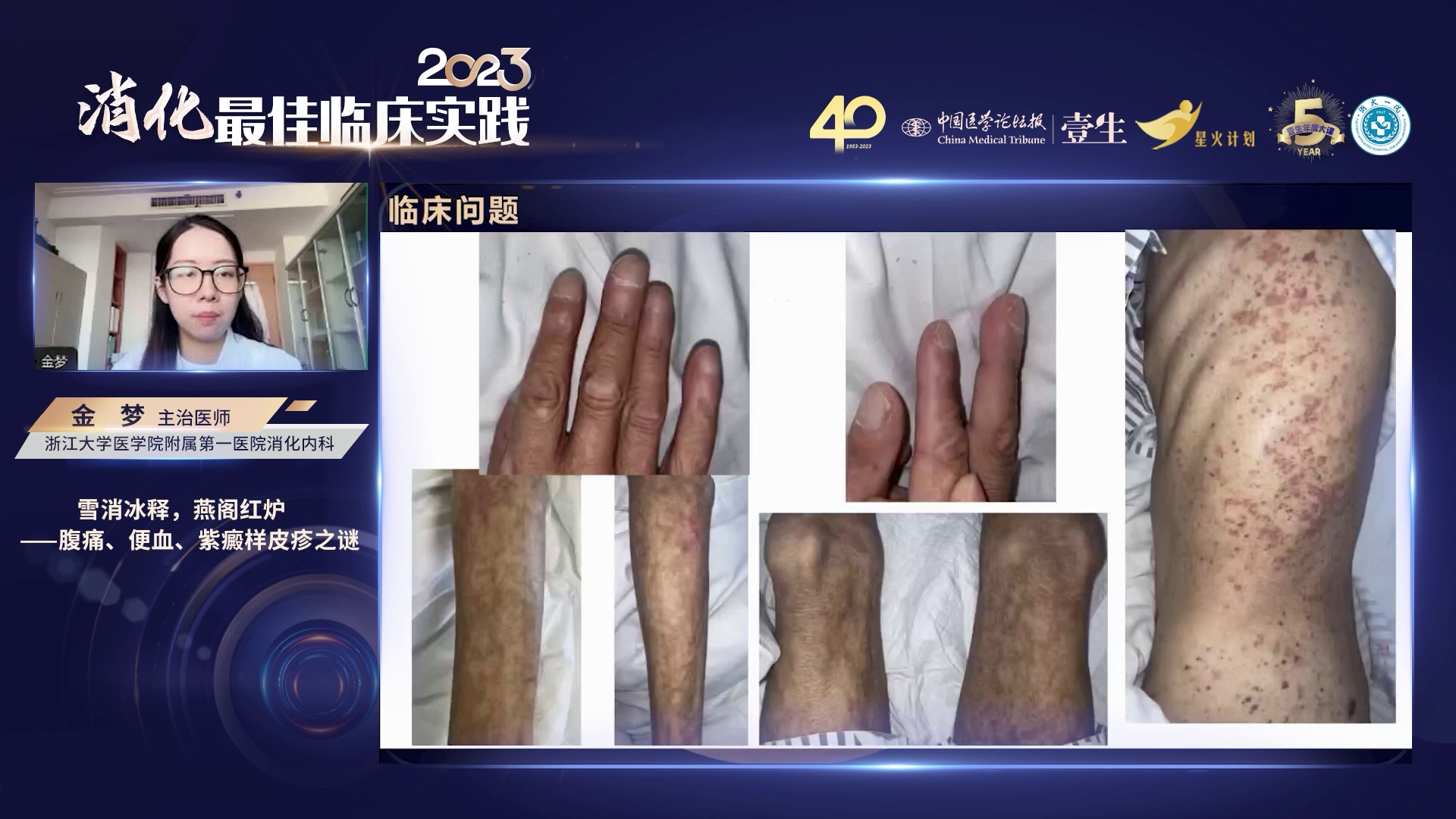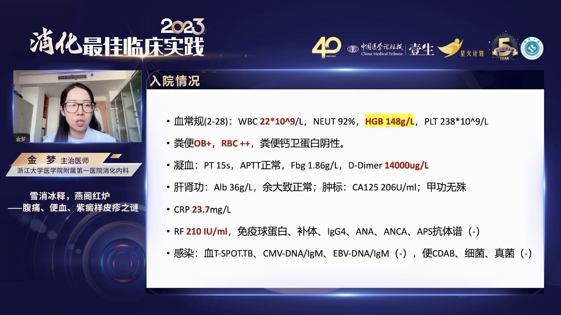 从消化科角度,见到紫癜样皮疹、胃肠道淤血样改变和尿蛋白,首先考虑过敏性紫癜,但该患者存在诸多不符之处。皮疹早于腹痛 28 年,与常见过敏性紫癜皮疹早于腹痛数日或一周不符;双下肢皮疹遗留网状青斑样交织色素沉着,与典型紫癜改变不同;且患者血三系变化显著,入院当天白细胞 22000,次日降至 7000,血红蛋白由148 g/L降至87 g/L,血小板拦腰减半,难以用过敏性紫癜解释。