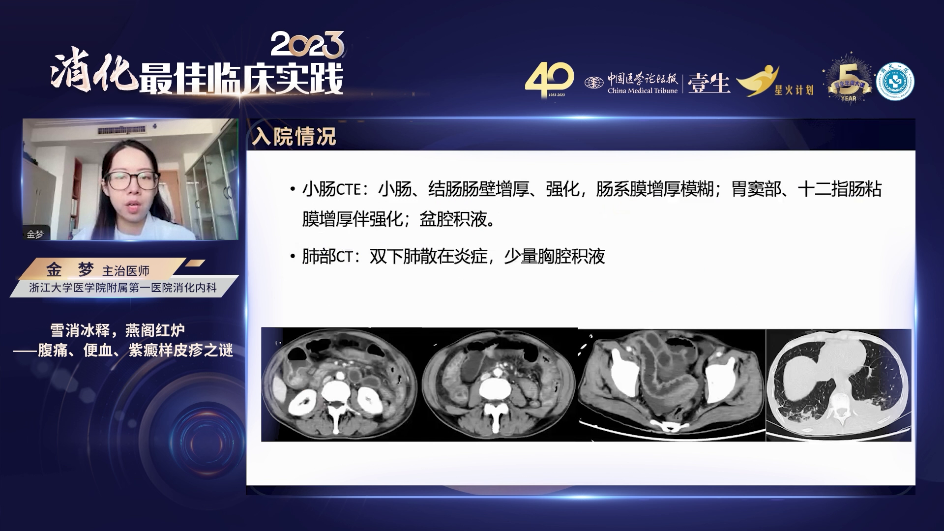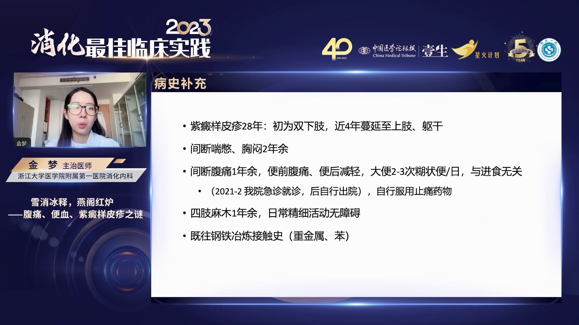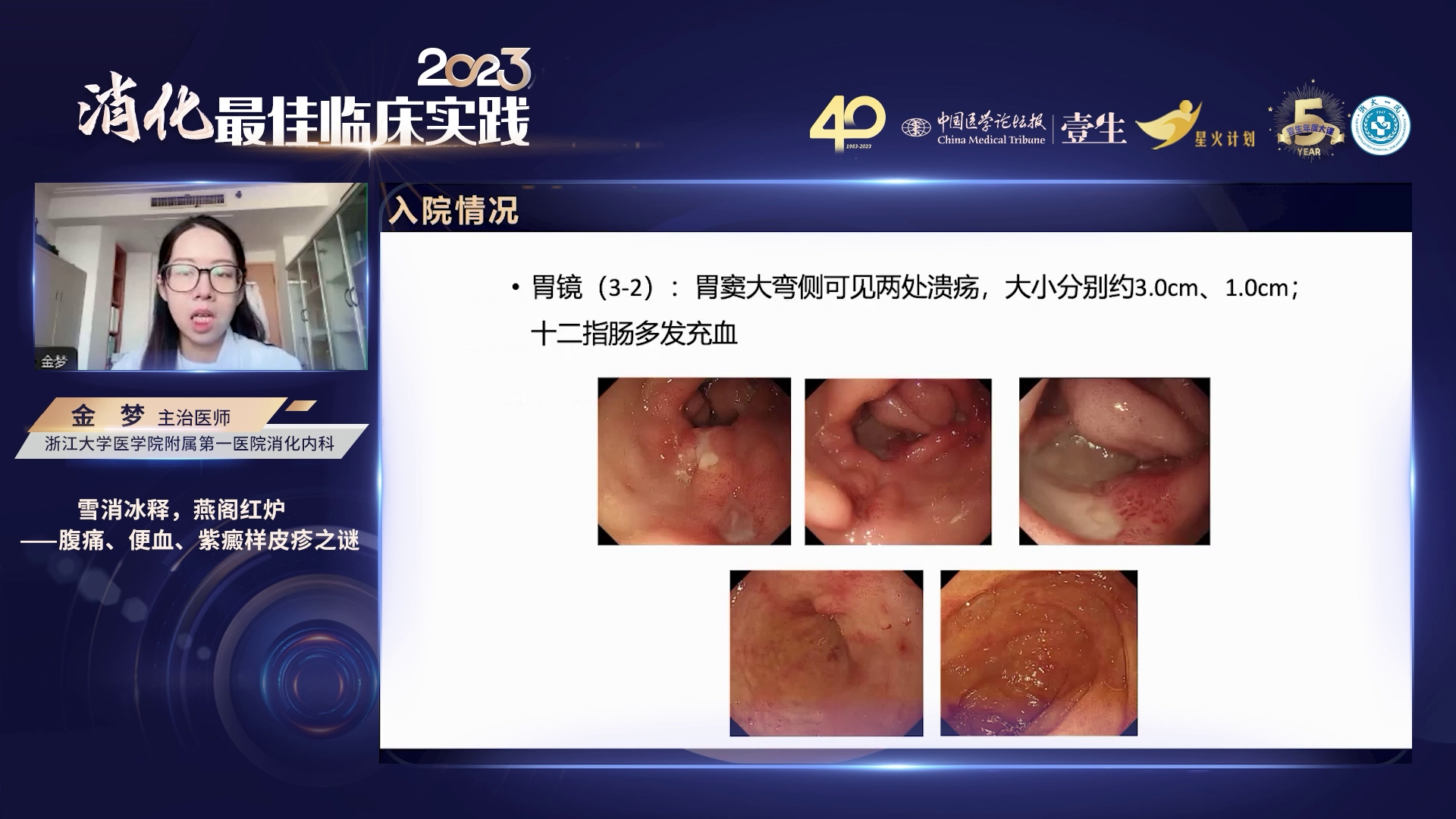 从消化科角度,见到紫癜样皮疹、胃肠道淤血样改变和尿蛋白,首先考虑过敏性紫癜,但该患者存在诸多不符之处。皮疹早于腹痛 28 年,与常见过敏性紫癜皮疹早于腹痛数日或一周不符;双下肢皮疹遗留网状青斑样交织色素沉着,与典型紫癜改变不同;且患者血三系变化显著,入院当天白细胞 22000,次日降至 7000,血红蛋白由148 g/L降至87 g/L,血小板拦腰减半,难以用过敏性紫癜解释。