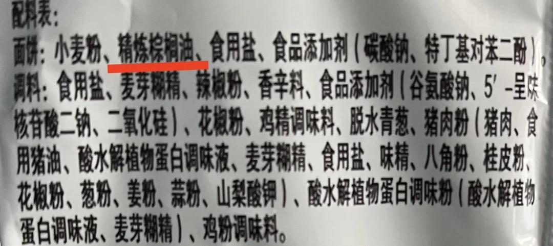 家庭食用油不会选择棕榈油,但是它经常被用于食品加工。以下是小编常吃零食的配料表: