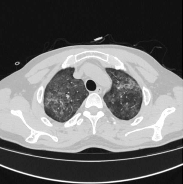 PCP是一种机会致病菌,常见于免疫功能低下患者,如艾滋病、长期使用免疫抑制类药物患者。本例患者在接诊初期未询问冶游史,HIV抗体阳性后追问补充病史。临床表现主要以干咳为主,伴有进行性呼吸困难,发热、腹胀、乏力等。PJP影像学表现为GGO,多内带分布,由肺门朝外,从中央向外周扩散,呈大片状或蝶翼征,双肺对称或不对称,可伴有腺泡结节、空气支气管征、铺路石征、实变及纤维条索状。CMP表现为急性间质性肺炎,伴有弥漫性肺泡水肿和纤维蛋白渗出物,典型影像学为GGO及微小结节。免疫功能低下患者,出现呼吸困难、低氧血症和影像学磨玻璃样改变时,应考虑到肺孢子菌及病毒性肺炎(如巨细胞病毒性肺炎等)的可能。