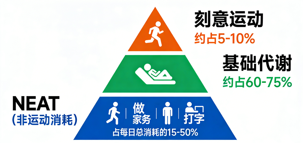 你可以把身体想象成一辆车:基础代谢是发动机空转的怠速油耗(维持生命);刻意运动是猛踩油门上高速,耗油大,但时间短。