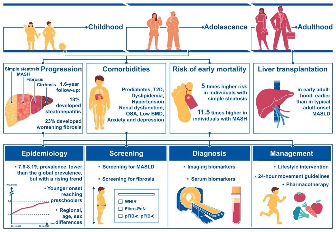 代谢相关脂肪性肝病是当前全球最常见的慢性肝病,在儿童与青少年中发病率逐年上升。中国作为肝病负担最重的国家之一,近年来随着生活方式改变和儿童肥胖率攀升,儿童代谢相关脂肪性肝病已成为不容忽视的公共卫生问题。本文揭示,中国儿童代谢相关脂肪性肝病的总体患病率虽低于国际平均水平,但近年来呈现持续上升趋势,并表现出明显的区域不平衡与性别差异。在筛查和诊断方面,本文系统梳理了适用于儿童的非侵入性筛查与诊断工具。在治疗方面,强调生活方式干预是当前核心的管理手段,同时也对特定患儿的药物治疗进行了探讨。