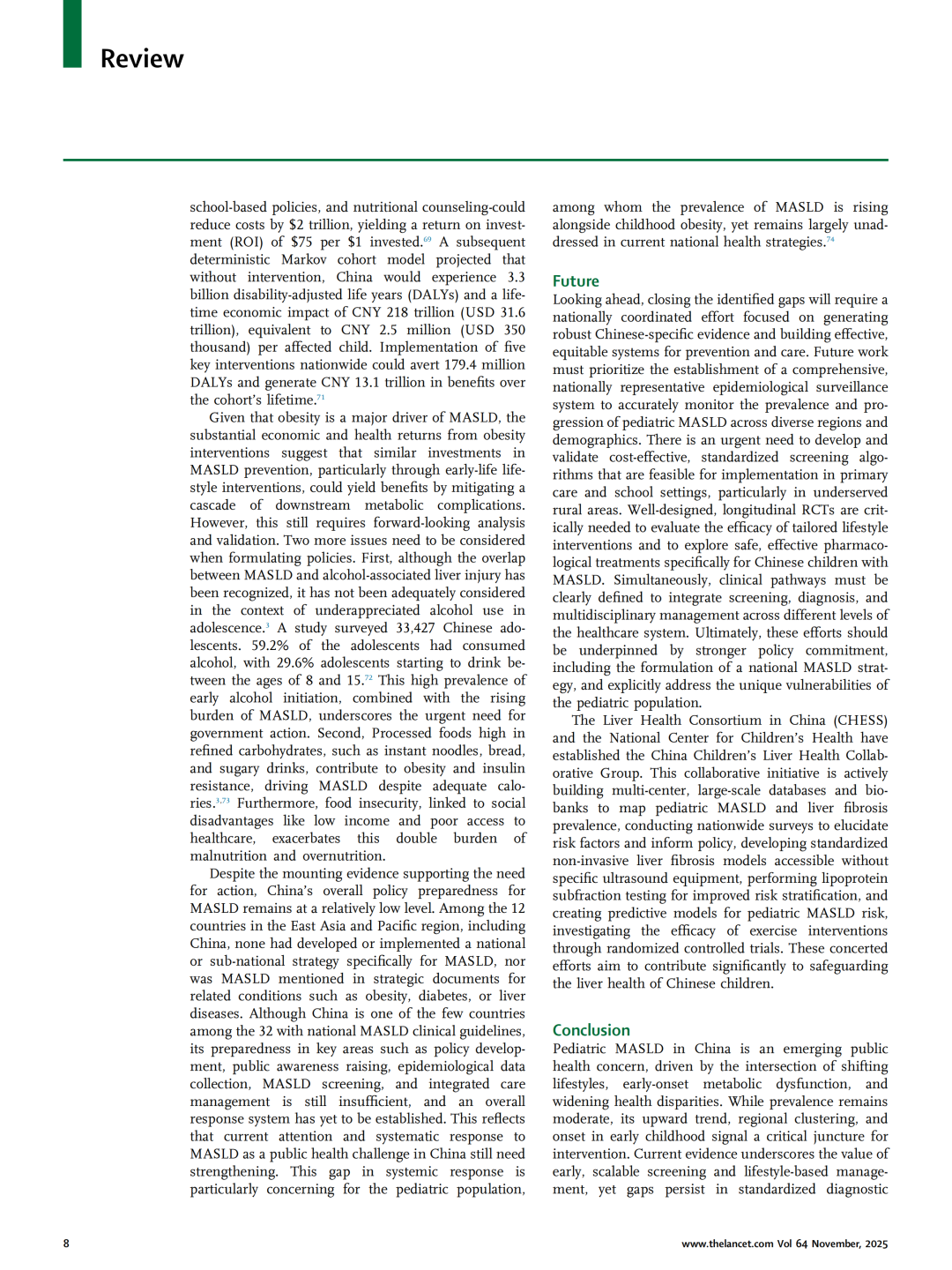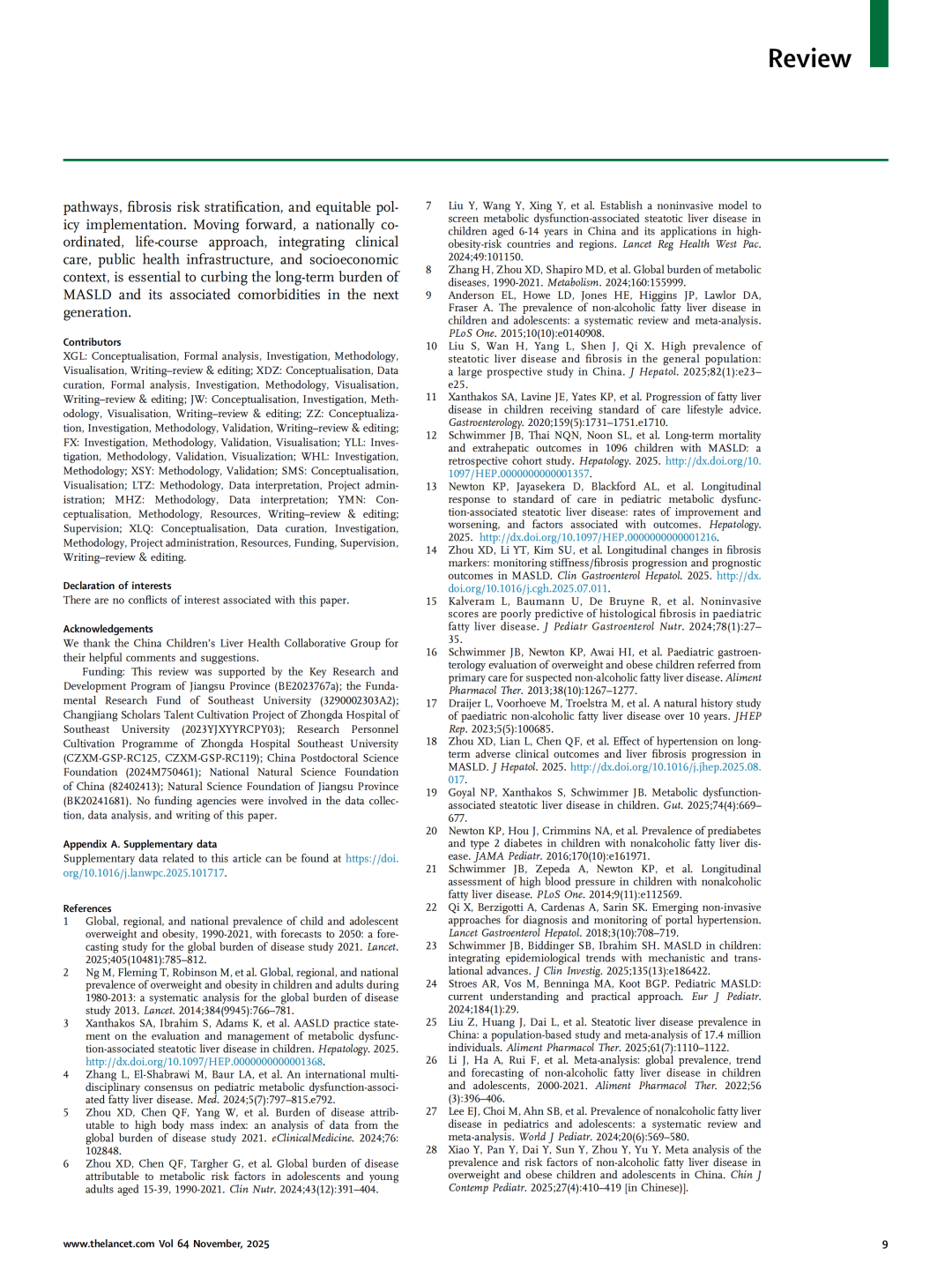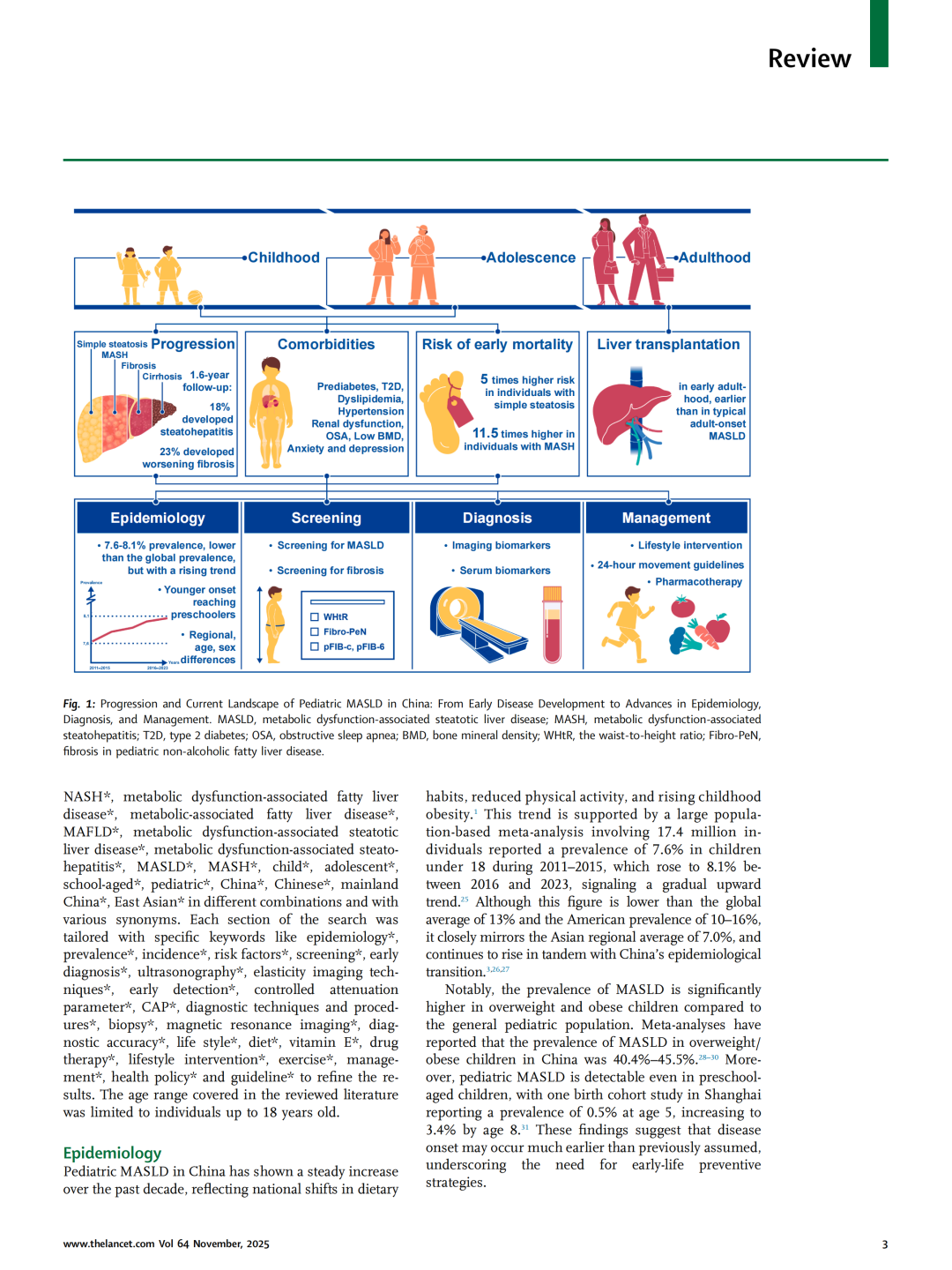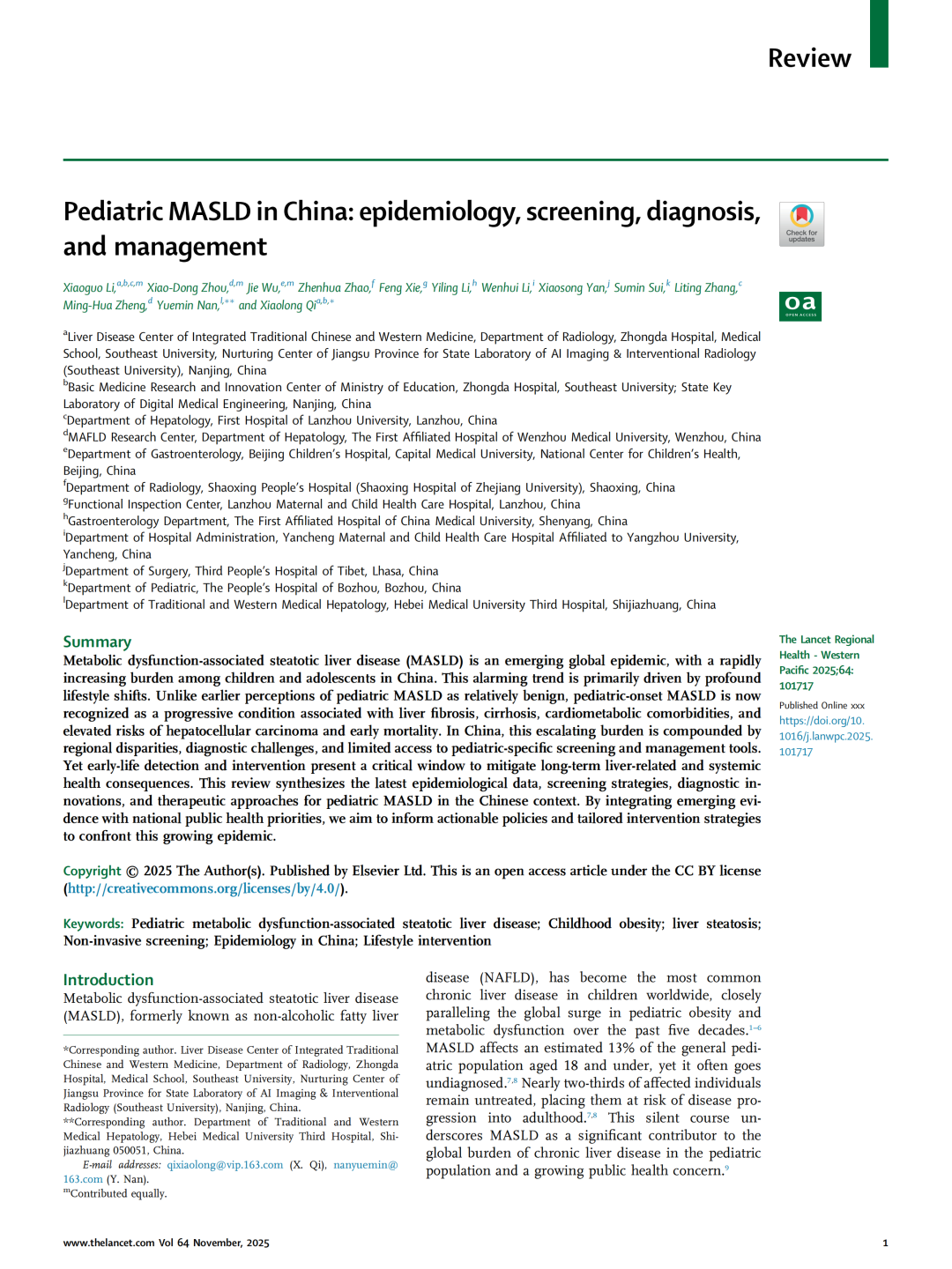 2025年10月18日,《柳叶刀-区域健康(西太平洋)》在线发表长篇综述,系统梳理了我国儿童代谢相关脂肪性肝病的流行病学、筛查策略、诊断技术和管理路径,为儿童代谢相关脂肪性肝病的防控体系建设提供科学依据。《柳叶刀-区域健康(西太平洋)》是柳叶刀旗下的一本开放获取期刊,创刊于2019年,是全球领先的关注西太平洋地区的综合医学期刊。CHESS肝脏健康联盟创始人祁小龙、中华医学会肝病学分会候任主任委员南月敏担任共同通讯作者。