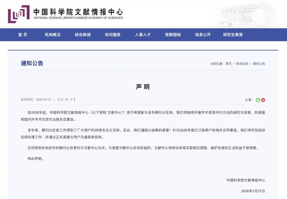 3月27日晚,中国科学院文献情报中心发布官方通告称“将不再更新与发布期刊分区表”,这标志着中国科学院期刊分区表正式停更。该声明特别强调,“任何其他机构发布的期刊分区表均与文献中心无关。”