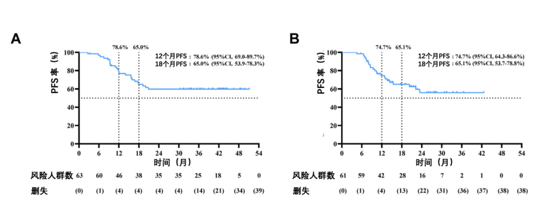 新辅助治疗后,队列A的ORR为90.5%[完全缓解(CR)8.0%,部分缓解(PR)82.5%],队列B为93.4%(CR 16.4%,PR 77.0%)。同步放化疗后ORR分别为93.7%(CR 81.0%,PR 12.7%)和93.4%(CR 67.2%,PR 26.2%)。队列A的中位随访时间为40.0个月,队列B为21.5个月。两队列的12个月PFS率分别为78.6%和74.7%,18个月PFS率为65.0%和65.1%(图1),18个月OS率分别为85.0%和82.5%,中位OS均未达到。两队列局部复发率为14.3%和24.6%,远处转移率为11.1%和1.6%。