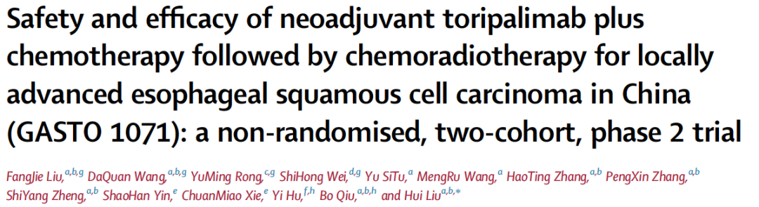 标题:新辅助特瑞普利单抗联合化疗序贯同步放化疗治疗局部晚期食管鳞癌(GASTO 1071):一项Ⅱ期非随机双队列研究