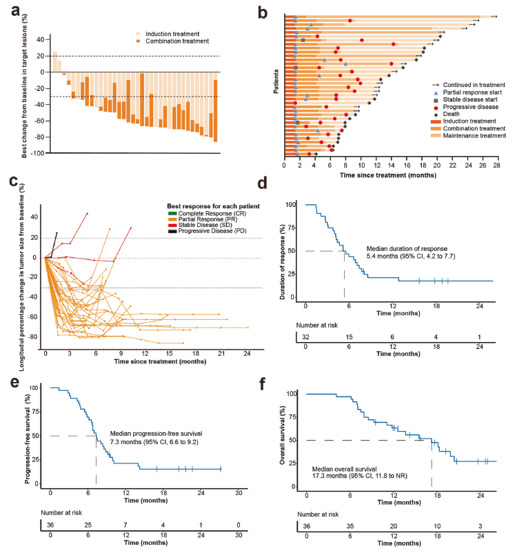 整个治疗结束后,94.4%的患者靶病灶有所缩小,ORR提高至88.9%,DCR为97.2%,中位无进展生存(PFS)期为7.3个月,中位总生存(OS)期为17.3个月。
