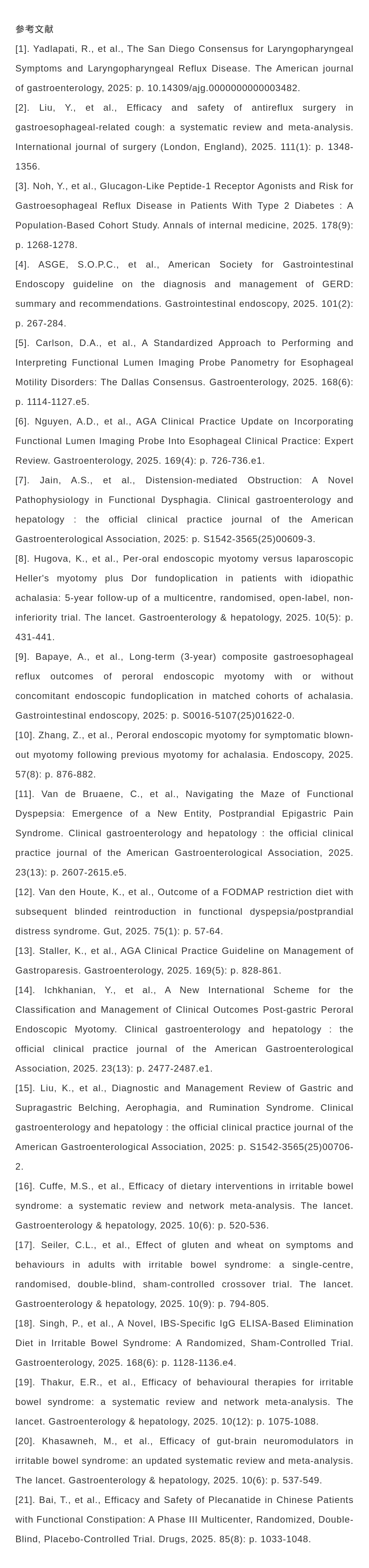 过去一年,GERD 领域的前沿研究仍聚焦于 “精准诊断” 与 “疗效优化” 两个方面。在这一核心框架下,GERD 临床研究版图仍在持续拓展,涌现出较多新兴的探索方向,包括以喉咽症状为主诉的 GERD诊治策略、新兴 GERD 亚型的特征描述与管理策略探索。