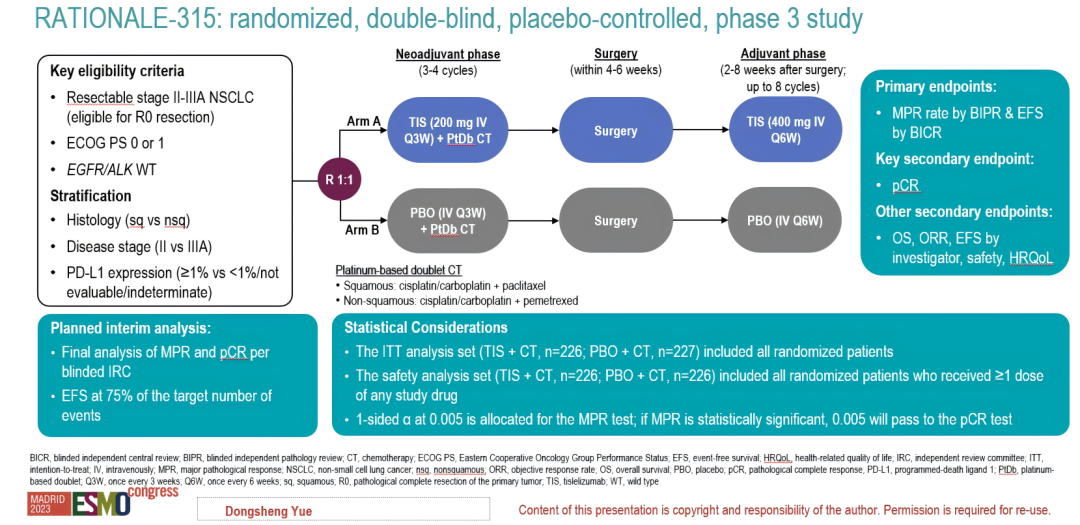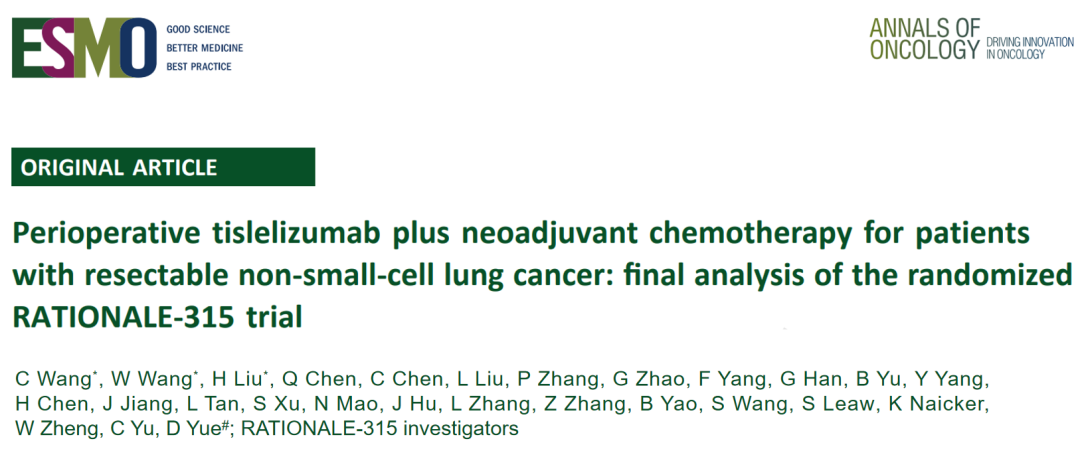 RATIONALE-315研究是一项随机、双盲、安慰剂对照的Ⅲ期临床研究(NCT04379635),旨在评估可切除Ⅱ-ⅢA期NSCLC患者接受替雷利珠单抗联合含铂双药化疗“新辅助+辅助”围手术期免疫全程治疗的疗效和安全性。其研究的主要终点是独立中心病理实验室盲审评估的MPR(主要病理缓解)和独立盲态中心审阅评估的EFS(无事件生存期)。该研究聚焦中国患者,共纳入453例可切除的Ⅱ-ⅢA期NSCLC患者,参与中心超过40家。天津医科大学肿瘤医院肺部肿瘤科单中心入组124例患者,开创了围手术期临床研究单中心入组记录。