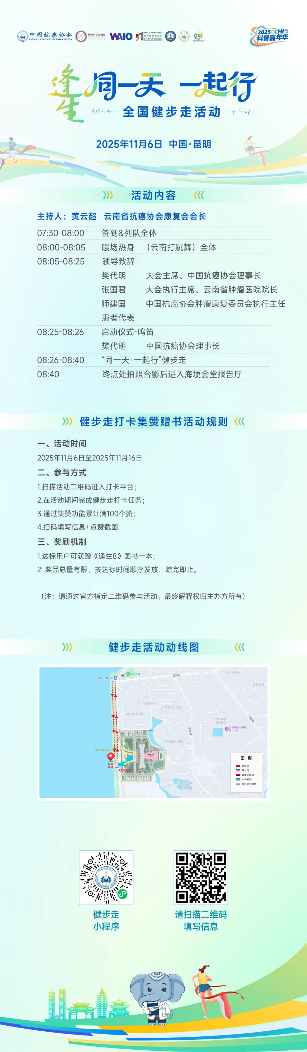 2025年11月6日,滇池之畔,暖阳正好。由中国抗癌协会主办的逢生患教系列活动 ——“同一天一起行” 全国健步走,将在昆明海埂大坝温柔启幕。作为科普嘉年华系列的首站,这场以 “生命” 为名的相聚,注定满是暖意与力量。