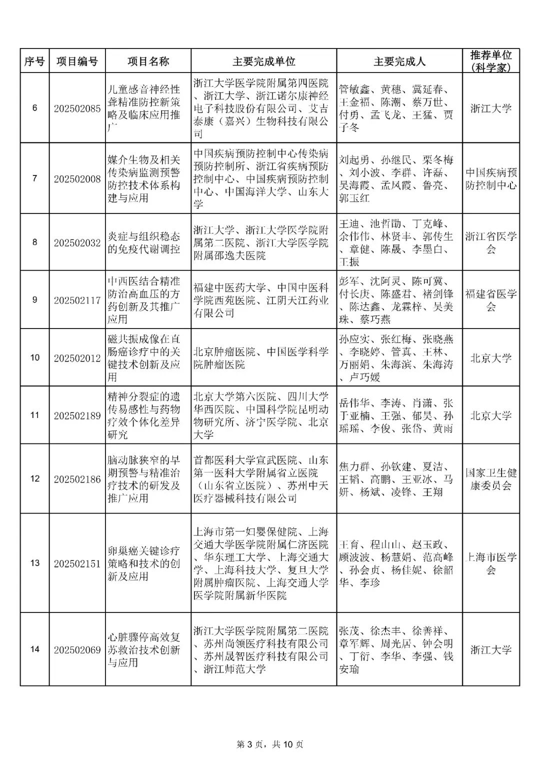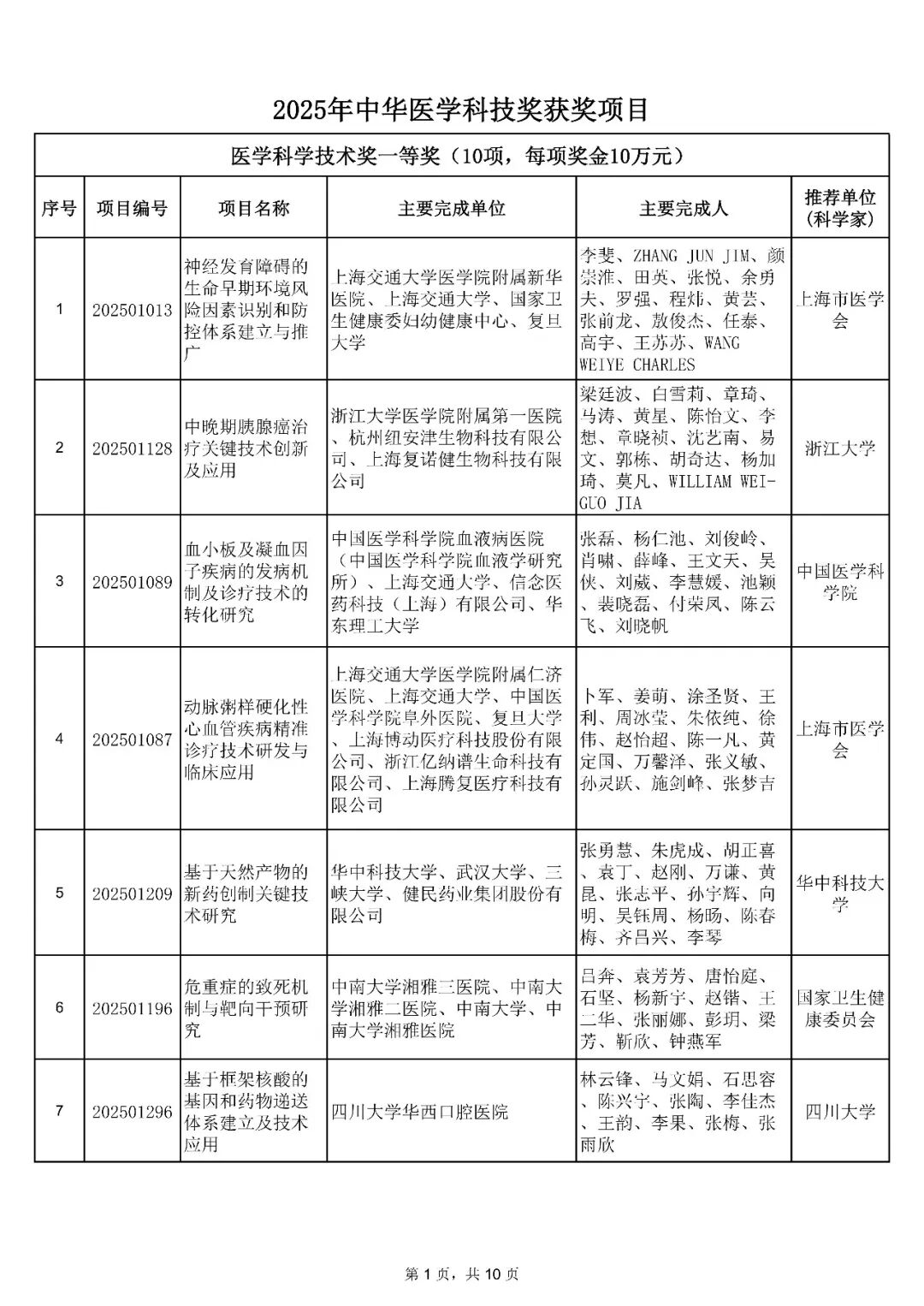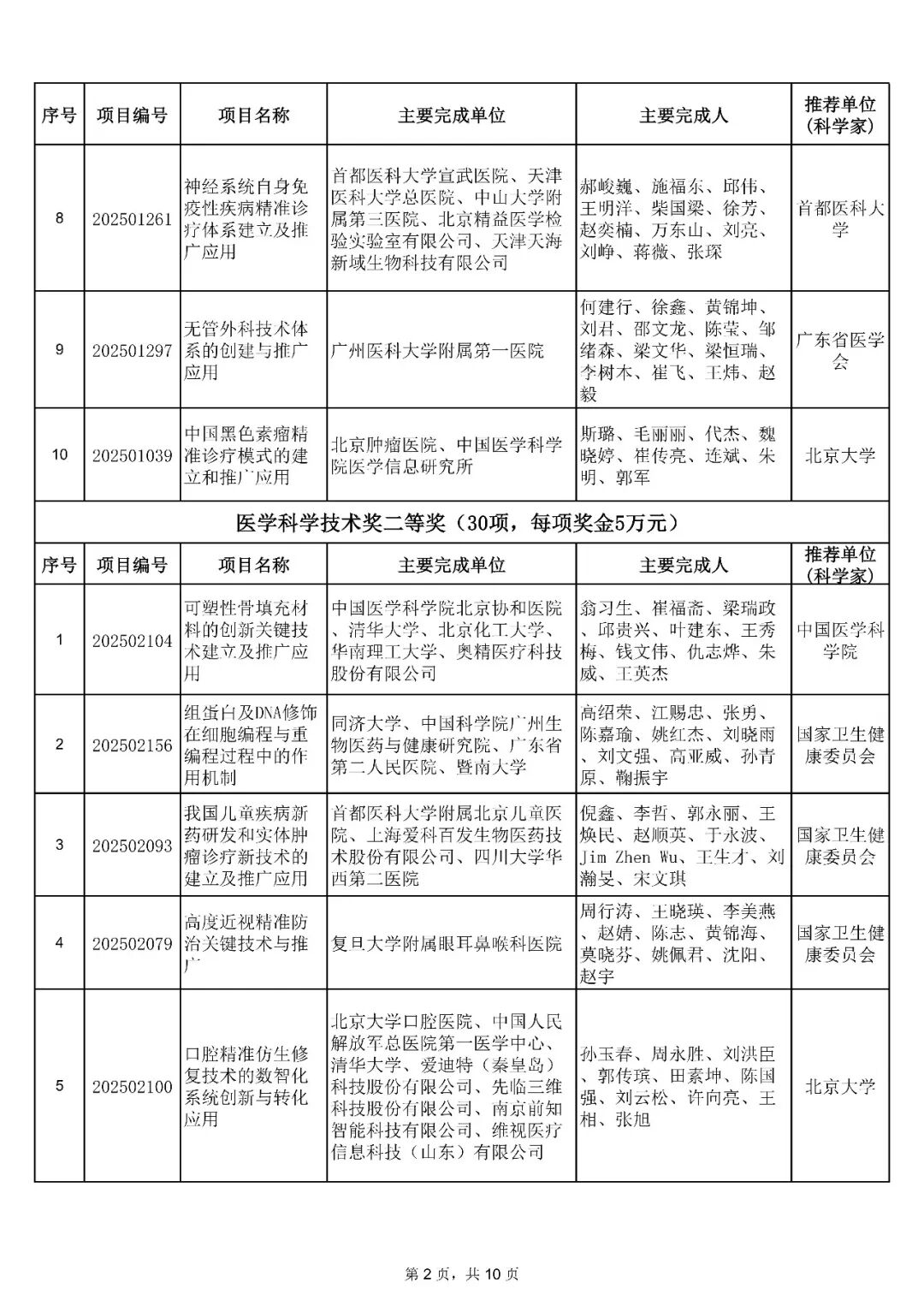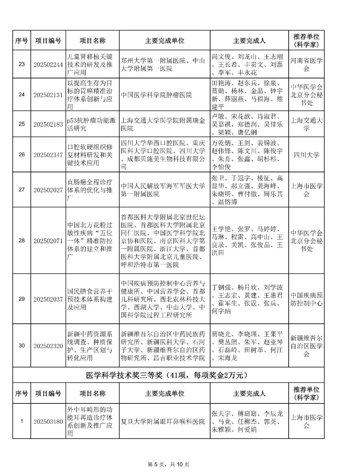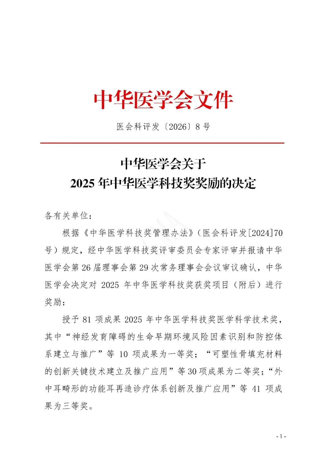 2026年1月14日,中华医学会发布了关于中华医学科技奖奖励的决定:授予81项成果2025年中华医学科技奖医学科学技术奖,其中“神经发育障碍的生命早期环境风险因素识别和防控体系建立与推广”等10项成果为一等奖;“可塑性骨填充材料的创新关键技术建立及推广应用”等30项成果为二等奖;“外中耳畸形的功能耳再造诊疗体系创新及推广应用”等41项成果为三等奖。