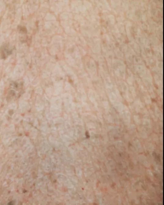 寻常型鱼鳞病的典型皮损特点是菱形或多角形的鳞屑,多见于四肢伸侧(尤其是小腿前)或腰背部,四肢屈侧、皱褶部位和胸腹部很少受累(可能是因为这些部位相对较为湿润),呈淡褐色或深褐色,鳞屑中心固着,周边稍微翘起,这种鱼鳞样的皮损也正是鱼鳞病名称的由来。