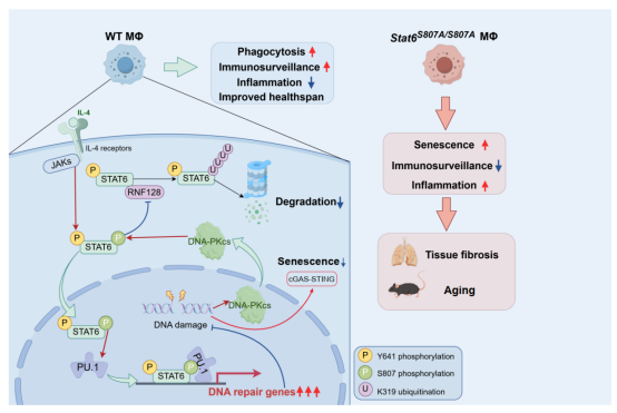 2026 年 2 月 24 日,北京大学第三医院呼吸与危重症医学科双聘教授、北京大学未来技术学院邱义福教授团队联合孙永昌教授团队,在Nature Communications发表题为 “DNA-PK-mediated phosphorylation of STAT6 establishes a non-canonical type 2 immunity axis to prevent macrophage senescence” 的研究论文。该研究揭示了调控巨噬细胞衰老的DNA-PK/STAT6/PU.1非经典2型免疫分子轴,首次在体内模型与临床样本中证实该通路异常与肺纤维化、慢阻肺病(COPD)的发生发展密切相关,为衰老相关慢性呼吸疾病的靶向干预提供了关键理论依据与潜在分子靶点。