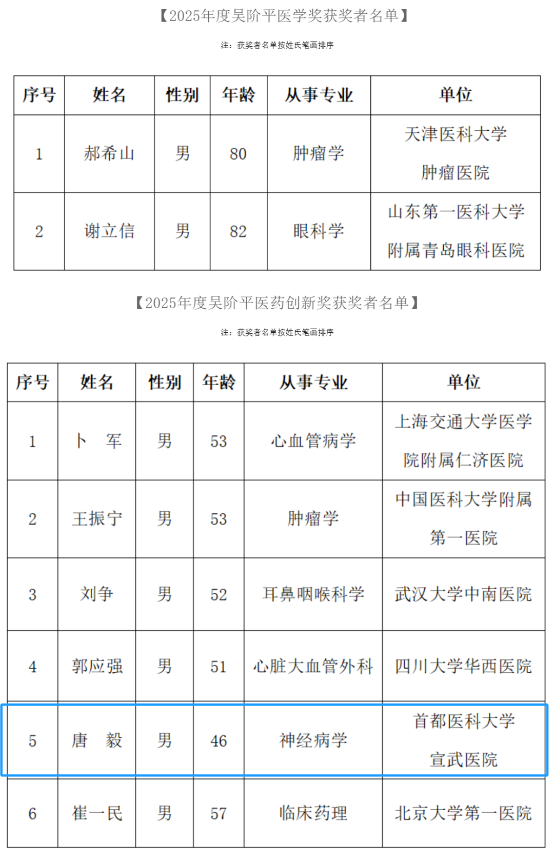 同时,对在2025年10月24日2025年度吴阶平医药创新奖评审会选出的6名获奖者进行确认,分别是上海交通大学医学院附属仁济医院卜军教授、中国医科大学附属第一医院王振宁教授、武汉大学中南医院刘争教授、四川大学华西医院郭应强教授、首都医科大学宣武医院唐毅教授和北京大学第一医院崔一民教授。