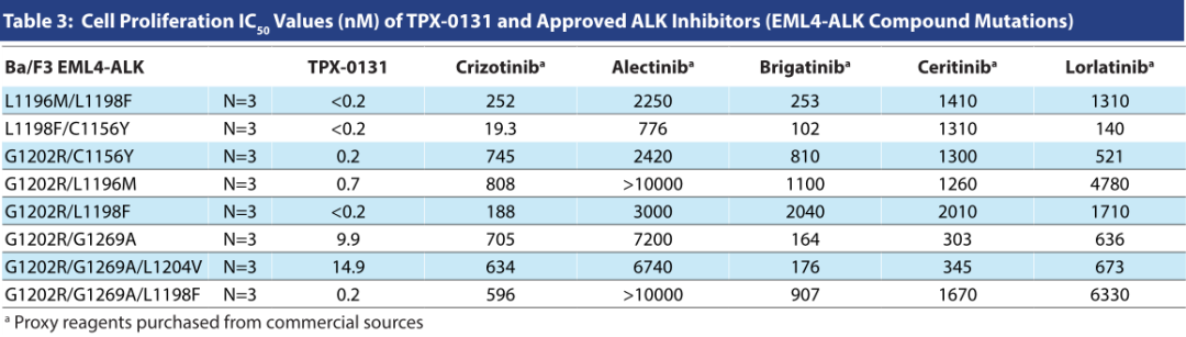 TPX-0131是一系列EML4-ALK复合突变最有效的抑制剂,而第1代、第2代和第3代ALK药物均表现为较低的活性和敏感性(表3)。