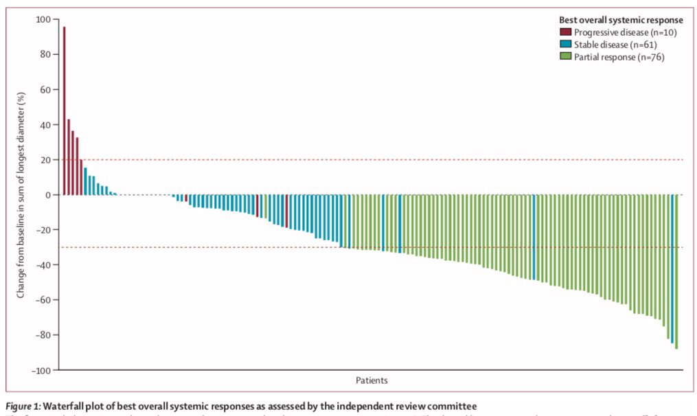 安全性:与治疗相关的最常见的不良事件是皮疹(56%)、ALT升高(46%)、AST升高(41%)、肌酐升高(19%)、便秘(18%)、瘙痒(18%)和面部水肿(16%)。36例(23%)患者发生了与治疗相关的3级不良事件,未报告与4级治疗相关的不良事件。
