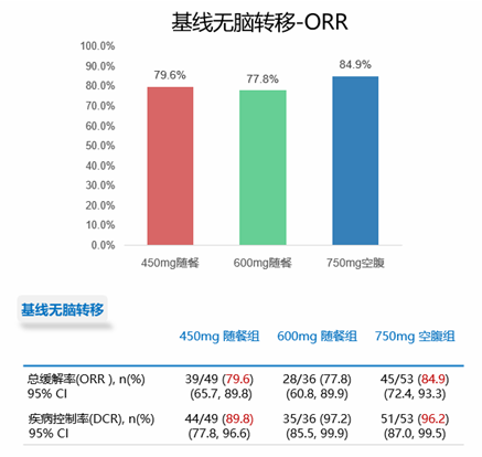 对于基线有脑转移患者,450 mg随餐方案和750 mg空腹方案同样获得较好缓解,而且450 mg随餐组在数值上有更好的趋势。